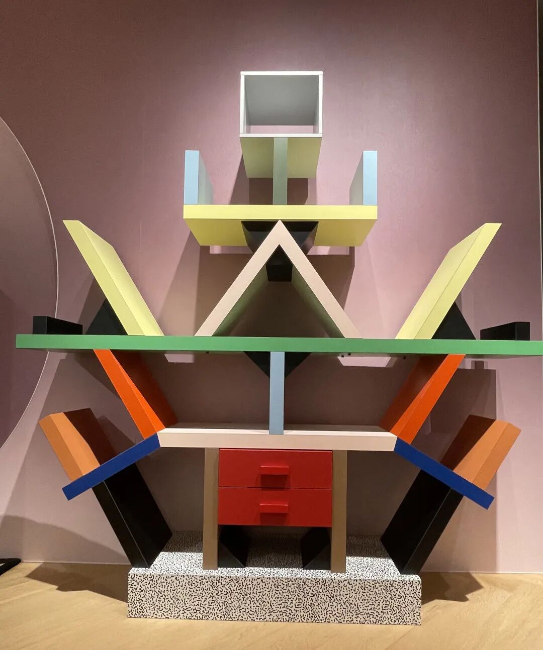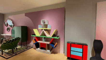不知道大家在这段gif中看没看到一个造型独特的书架,这个Carlton书架是Memphis品牌感性自由的设计主张的体现,让人眼前一亮的三原色的搭配、滑稽怪诞的造型,充满童趣和天真,以审美价值的追求完成对功能的新解释。Memphis主要从波普艺术和装饰艺术中汲取灵感,风格的精髓就在于它的色彩和丰富的几何图形。