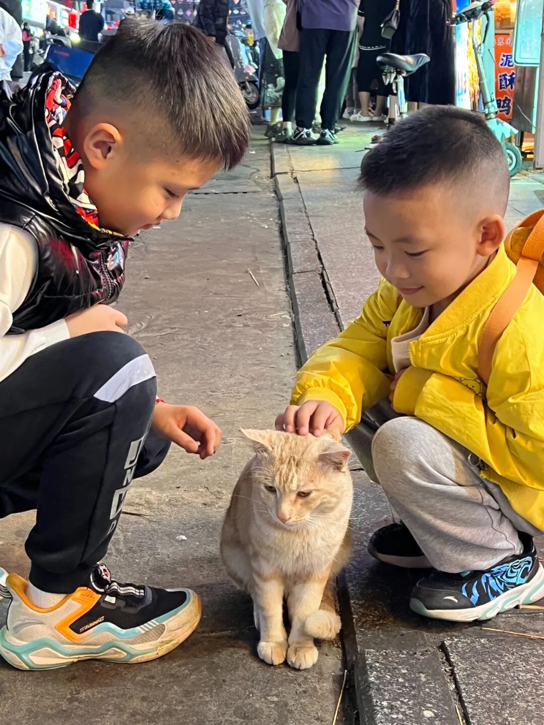 带家里小朋友出门玩的时候偶遇到了一只猫咪,于是给他们拍下了这张非常有爱的合照!猫咪可爱,小朋友们也很可爱~