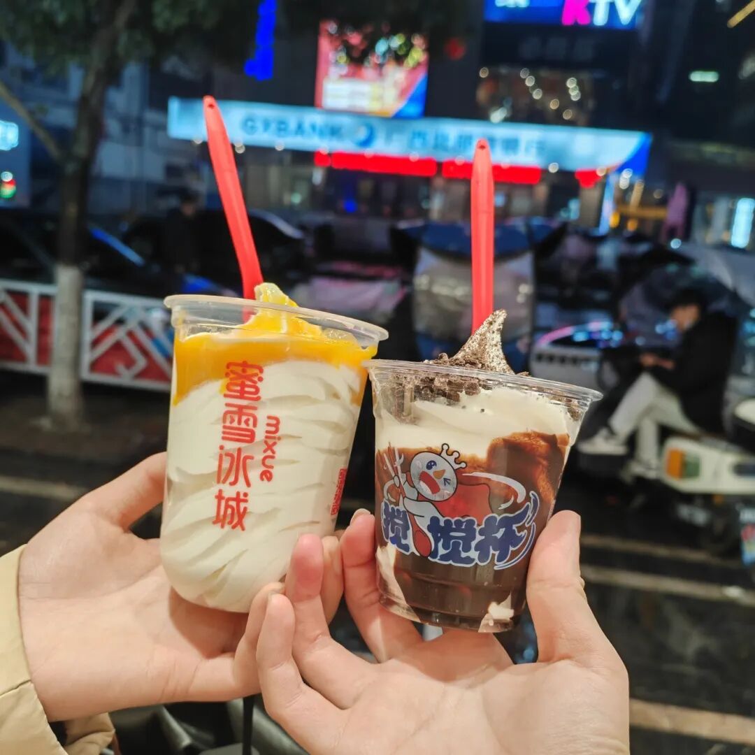 寒假和好朋友们见面吃的冰激凌!他们早就开始约饭,但是我一直没有放假,他们就在等我回家才约(感动)这是饭后我们边聊天边散步突然想吃冰激凌去买的,另外两个朋友不吃,所以就是两个冰激凌的碰杯,实际上是四个人的喜悦。