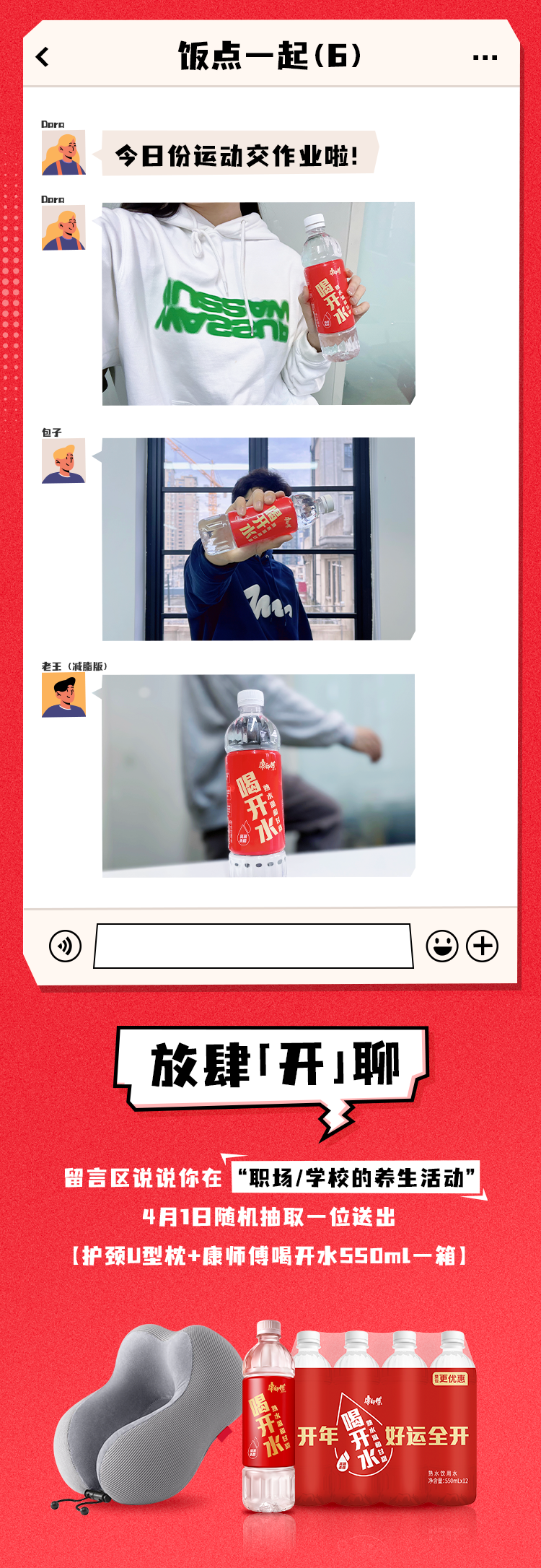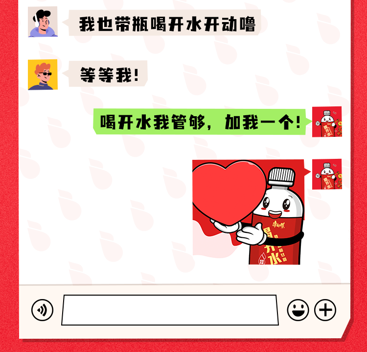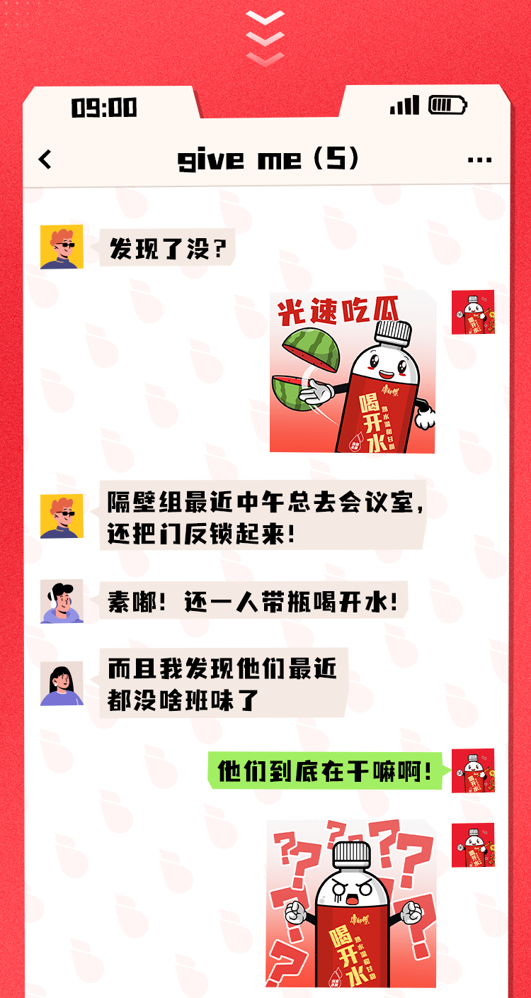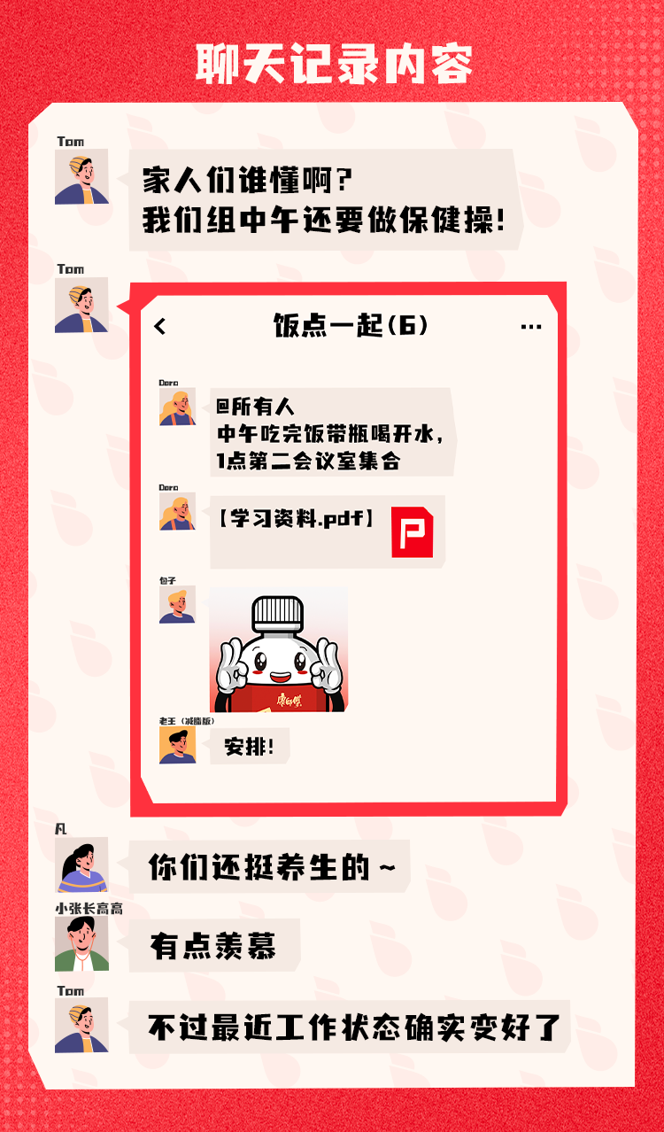 推荐:「点击展开」瞧瞧职场人的聊天记录,「点击弹出」查看聊天记录内容,借此宣传康师傅喝开水,吸引更多客户传播并购买。