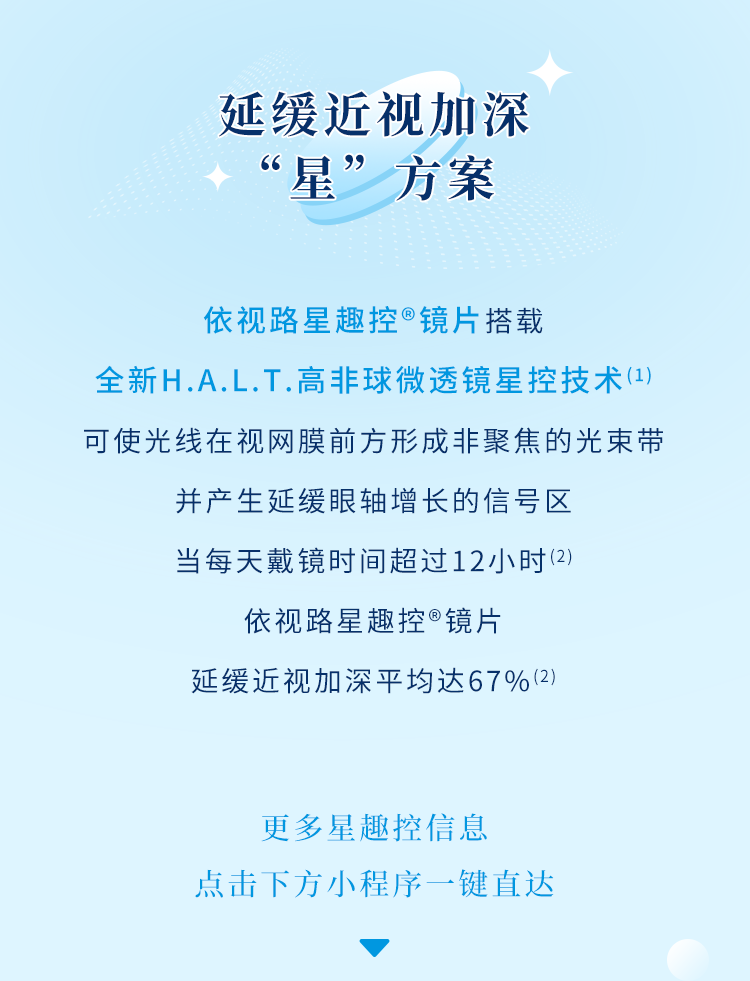 (1) 数据来源:温州医科大学附属眼视光医院于2018年开始进行的有关近视控制的前瞻性随机双盲对照临床试验 (中国临床试验注册中心注册号ChiCTR1800017683)两年期试验结果,该试验将104名近视儿童随机分为两组分别配戴星趣控镜片(54名,即研究组)和单光镜片(50名,即对照组)。67%的数据是一项平均数据,基于试验中连续两年每日配戴星趣控镜片12小时以上的32名儿童, 按照“(对照组近视进展量(D)—研究组近视进展量(D))/ 对照组近视进展量(D) x 100%”之计算公式而得出。保金华、黄莹莹、李雪、艾德琳∙杨、周丰超、吴筠倩、王楚、李宇豪、Lim, E.W.、 Spiegel, D.P.、Drobe, B.、陈浩等,2022年,用于近视控制的非球面微透镜框架眼镜与单光眼镜对比:一项随机临床试验,美国医学会杂志-眼科,472–478,https://doi.org/10.1001/jamaophthalmol.2022.0401。该临床试验所用镜片均来自于本公司。