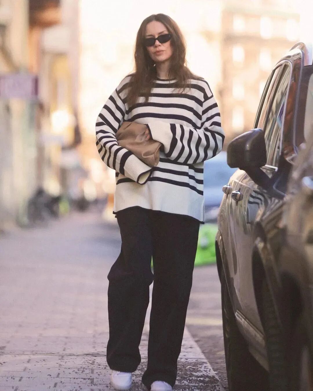 条纹衫一直是衣柜里的常青基础款,简约的黑白交叉设计,在视觉上自带层次空间,很适合H型直筒身材的姐妹。