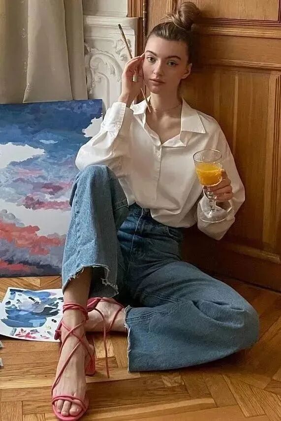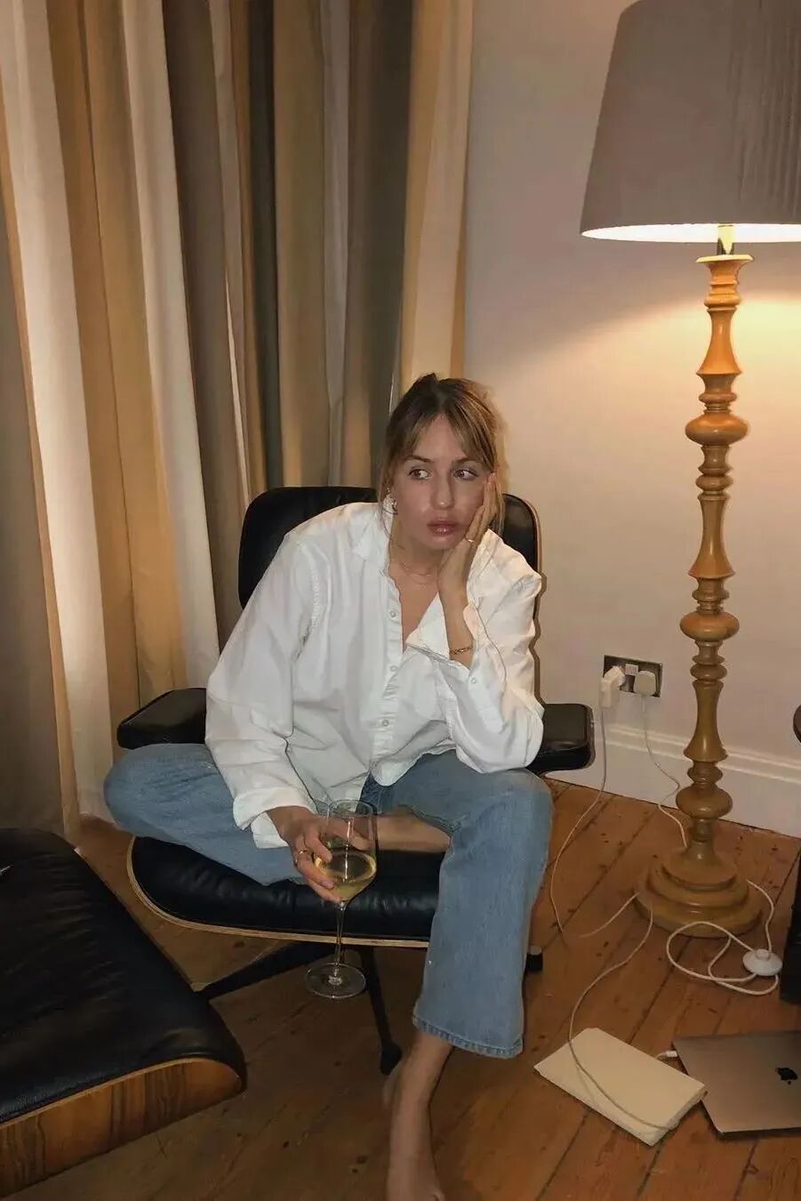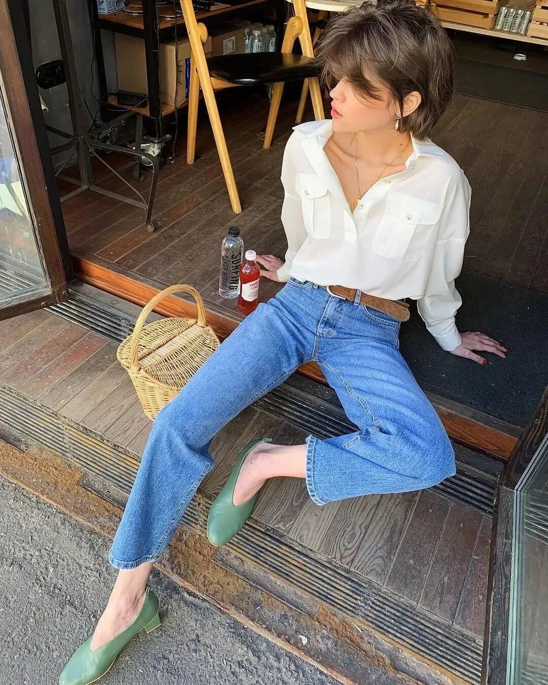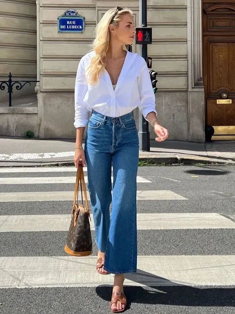 如果担心衬衣+牛仔裤太死板,可以挑选领口设计更加多样化的上衣,甚至可以直接大胆在内穿一件小吊带,再将白衬衣滑至肩膀,慵懒法式Get!