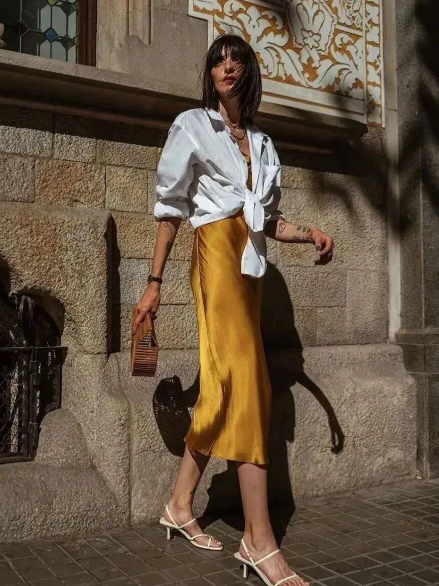 如果平日的校园穿搭比较“姐系”的朋友,那一定要试试丝缎连衣裙+白衬衣的搭配,轻轻在腹部系上活结,艺术感温婉气质立马拿捏~