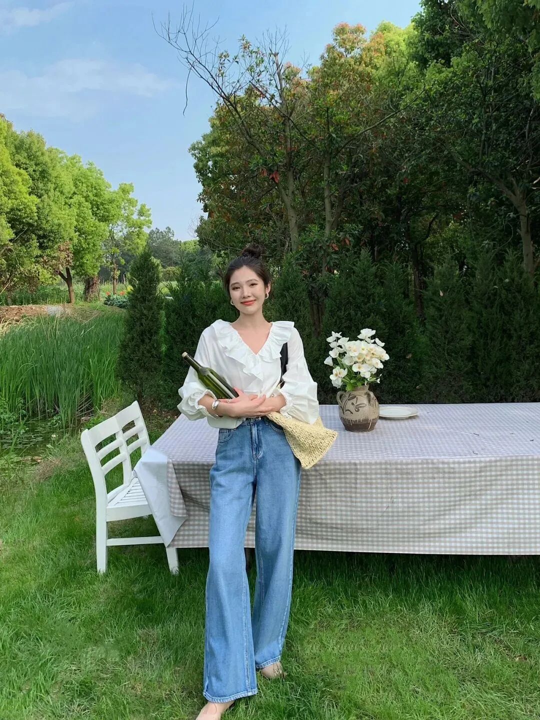 稳妥一些的姐妹,可以选用带有流苏、蕾丝、喇叭袖等元素的白衬衣,自带少女元气感。