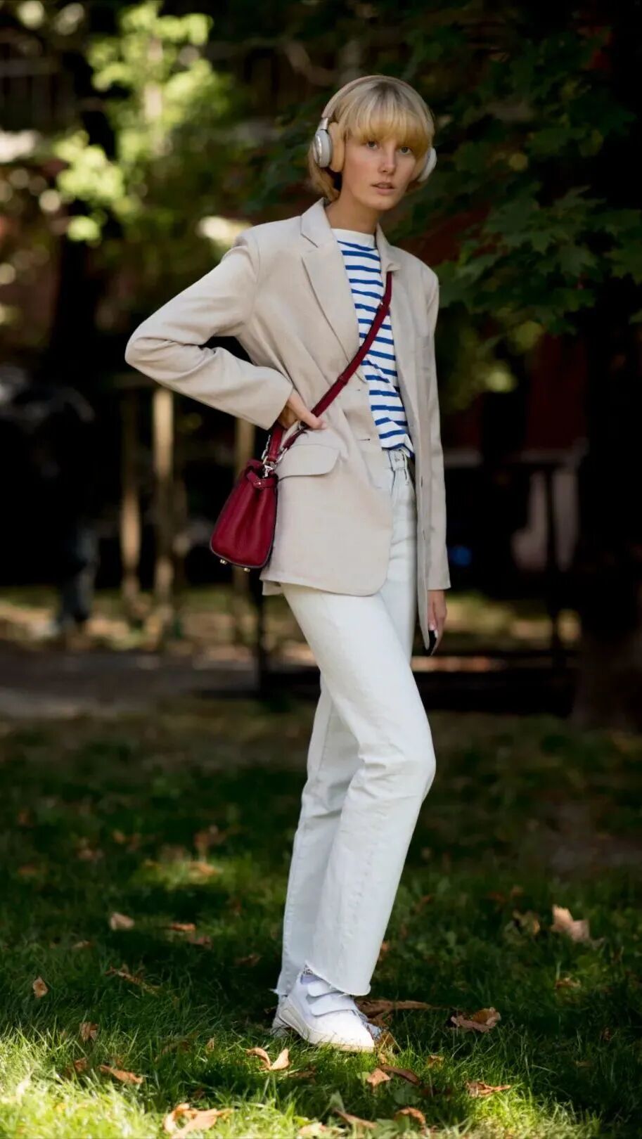 条纹衫的搭配选择相当丰富,其中的最佳拍档莫过于丹宁牛仔裤,这对经典CP请务必锁死!