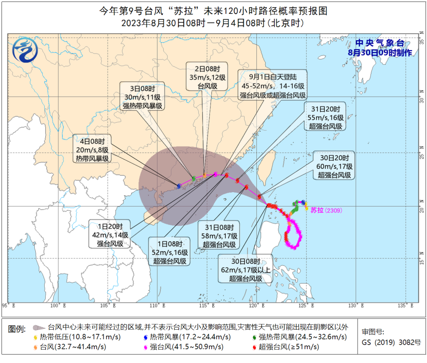 今天(8月30日)17时,今年第9号台风“苏拉”(超强台风级)中心位于北纬20点5度,东经120点1度,也就是在距离汕尾东南方向约480公里的巴士海峡海面上,中心附近最大风力17级以上。预计“苏拉”将于30日下半夜进入南海东北部海面,趋向广东中东部海面,较大可能于9月1日白天在粤东沿海登陆(强台风级,15级左右),也有可能在广东东部近岸海面向西偏南方向移动,强度缓慢减弱。