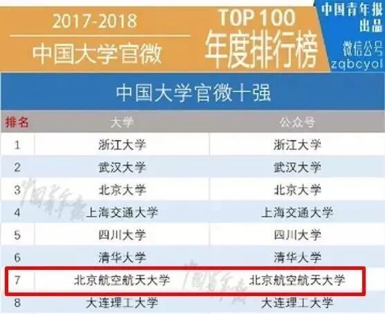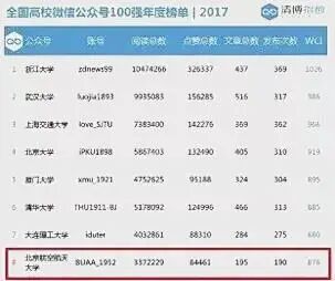 “清博指数”统计全国高校微信公众号100强2017年度榜单,北航位列十强。