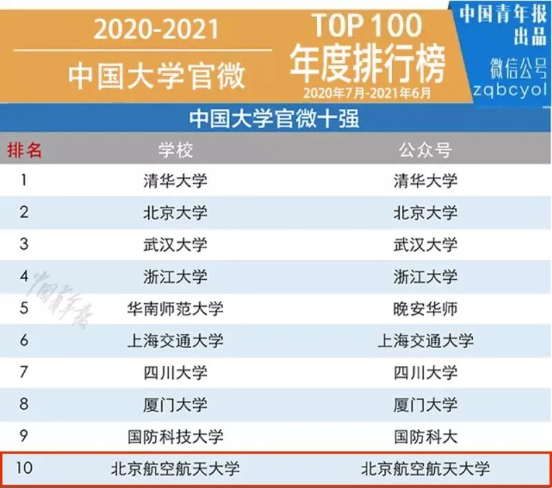 2021年7月,北航获得2020-2021年度中国大学官微十强。