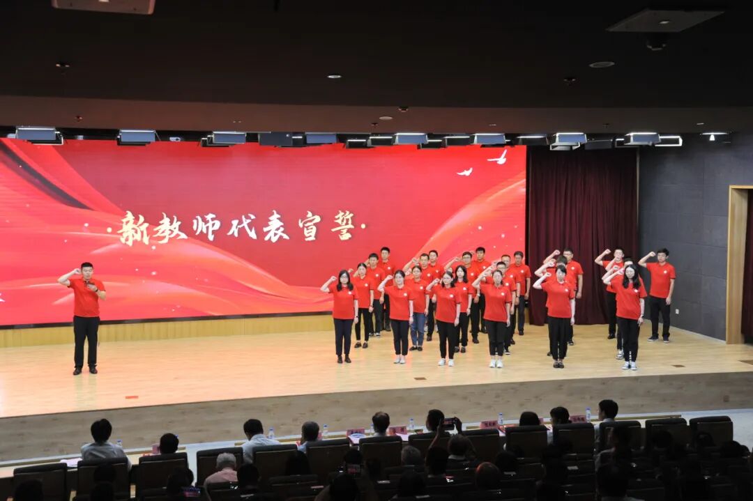新教师代表在环境与生命学部教师曲超的带领下进行宣誓,表示要主动肩负起开创世界一流大学建设新局面的历史重任,走上三尺讲台,走上教学服务一线,贡献青春年华,担当筑梦育人使命。