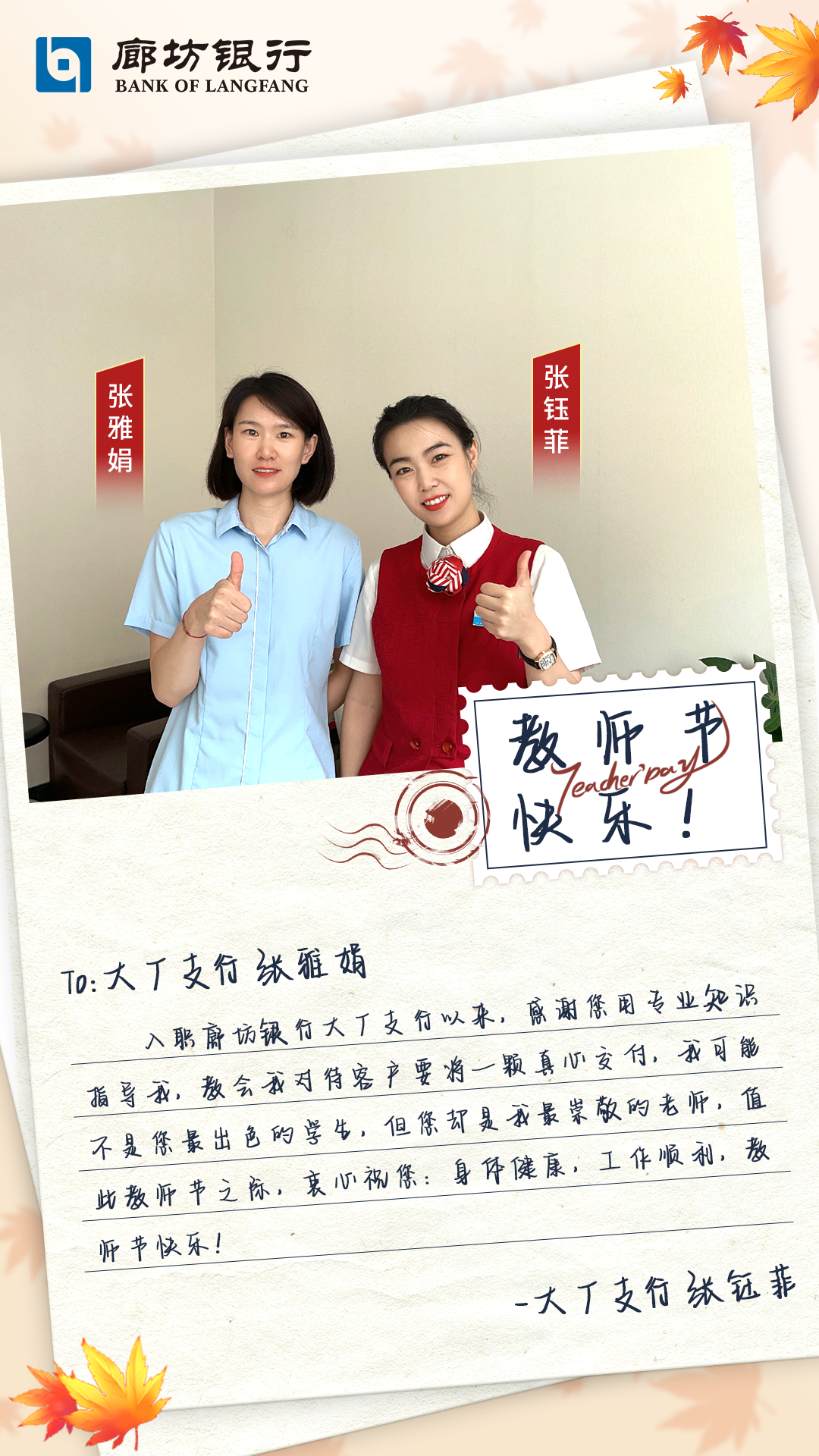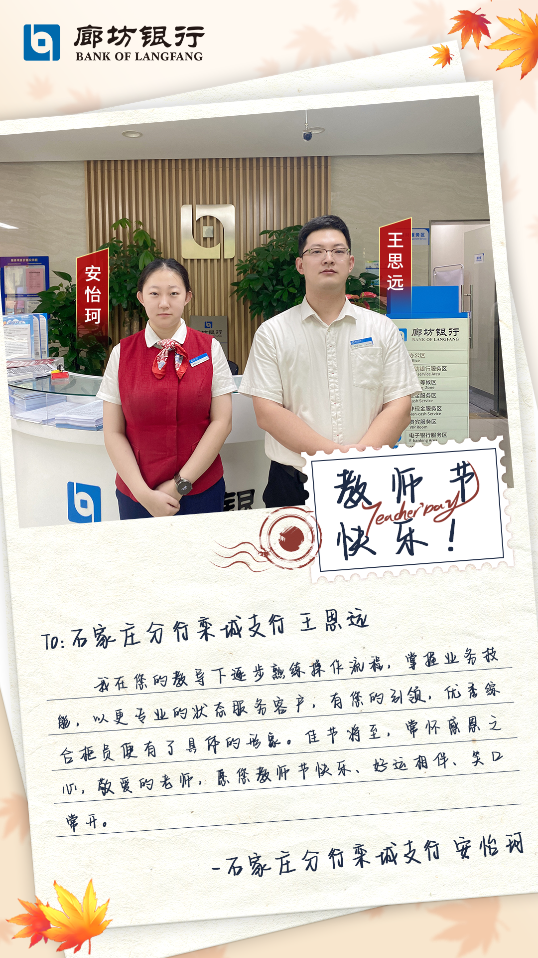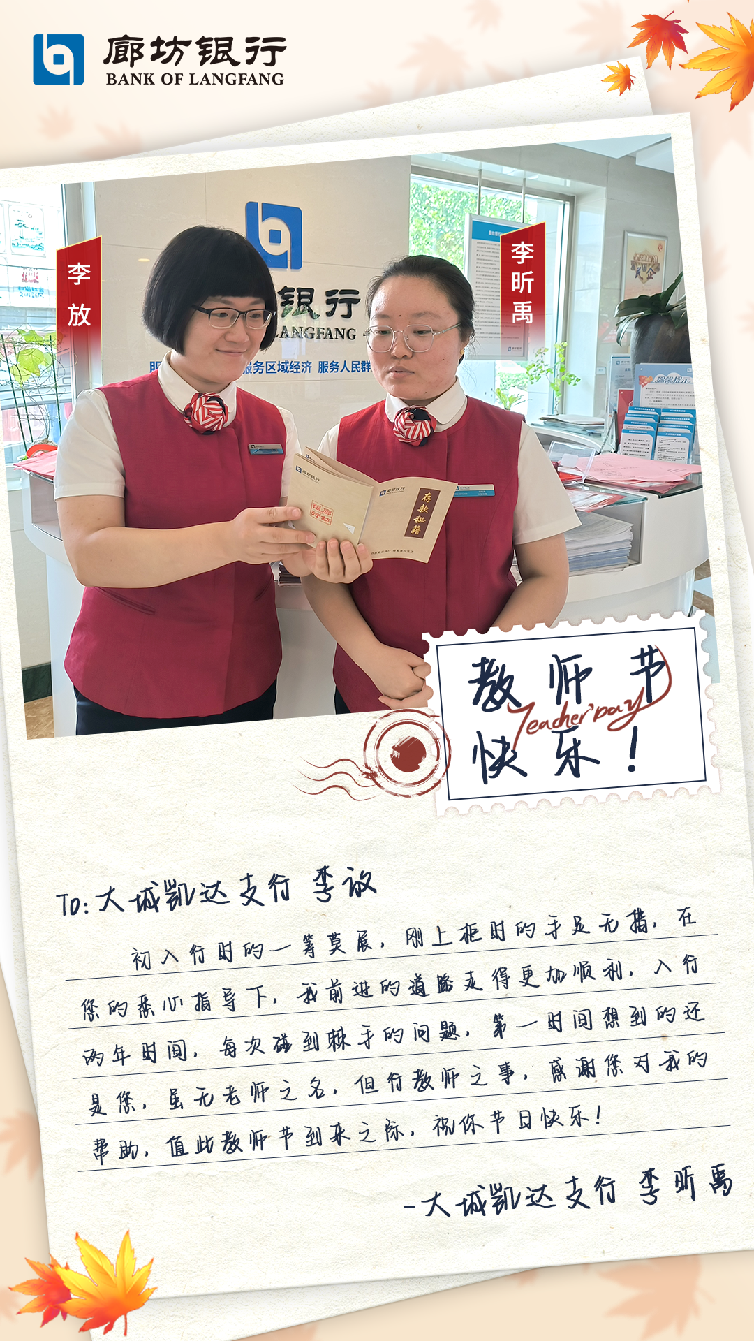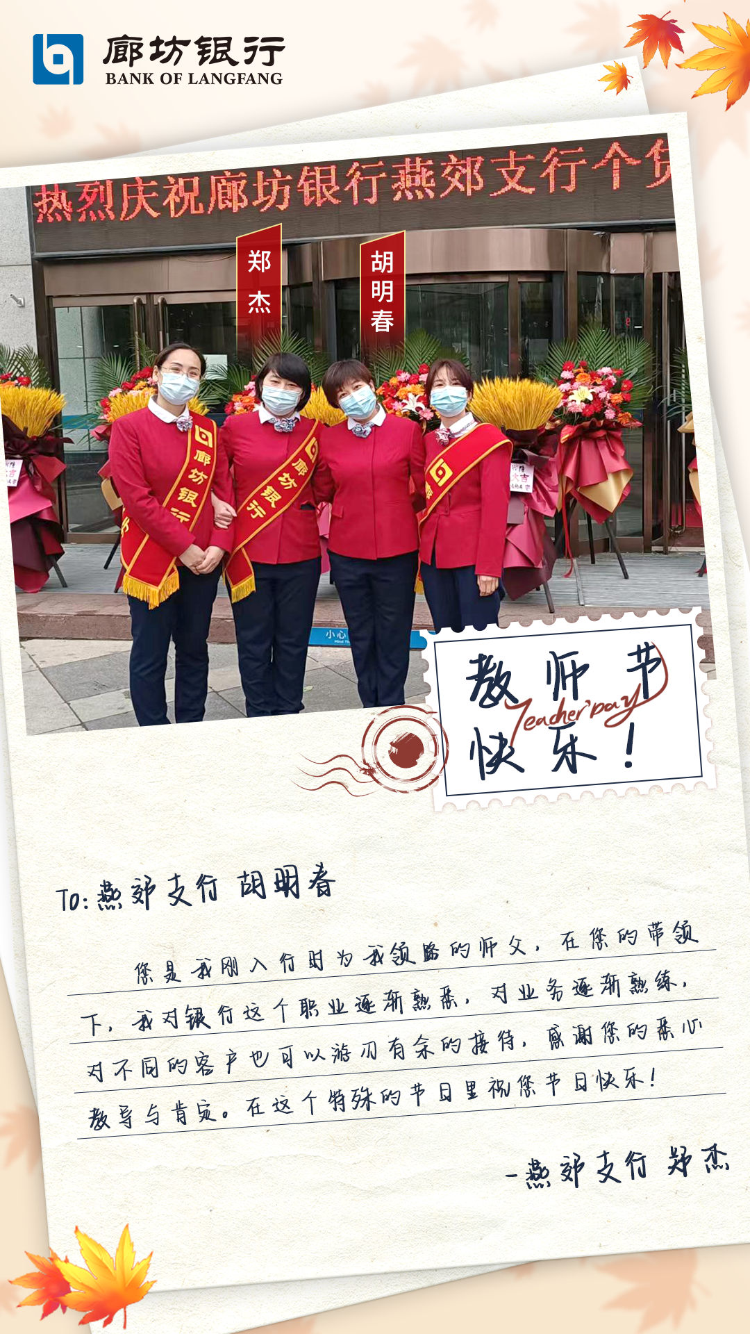 入职廊坊银行大厂支行以来,感谢您用专业知识指导我,教会我对待客户要将一颗真心交付,我可能不是您最出色的学生,但您却是我最崇敬的老师,值此教师节之际,衷心祝您:身体健康,工作顺利,教师节快乐!