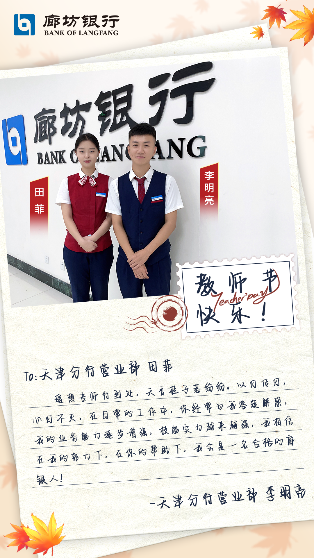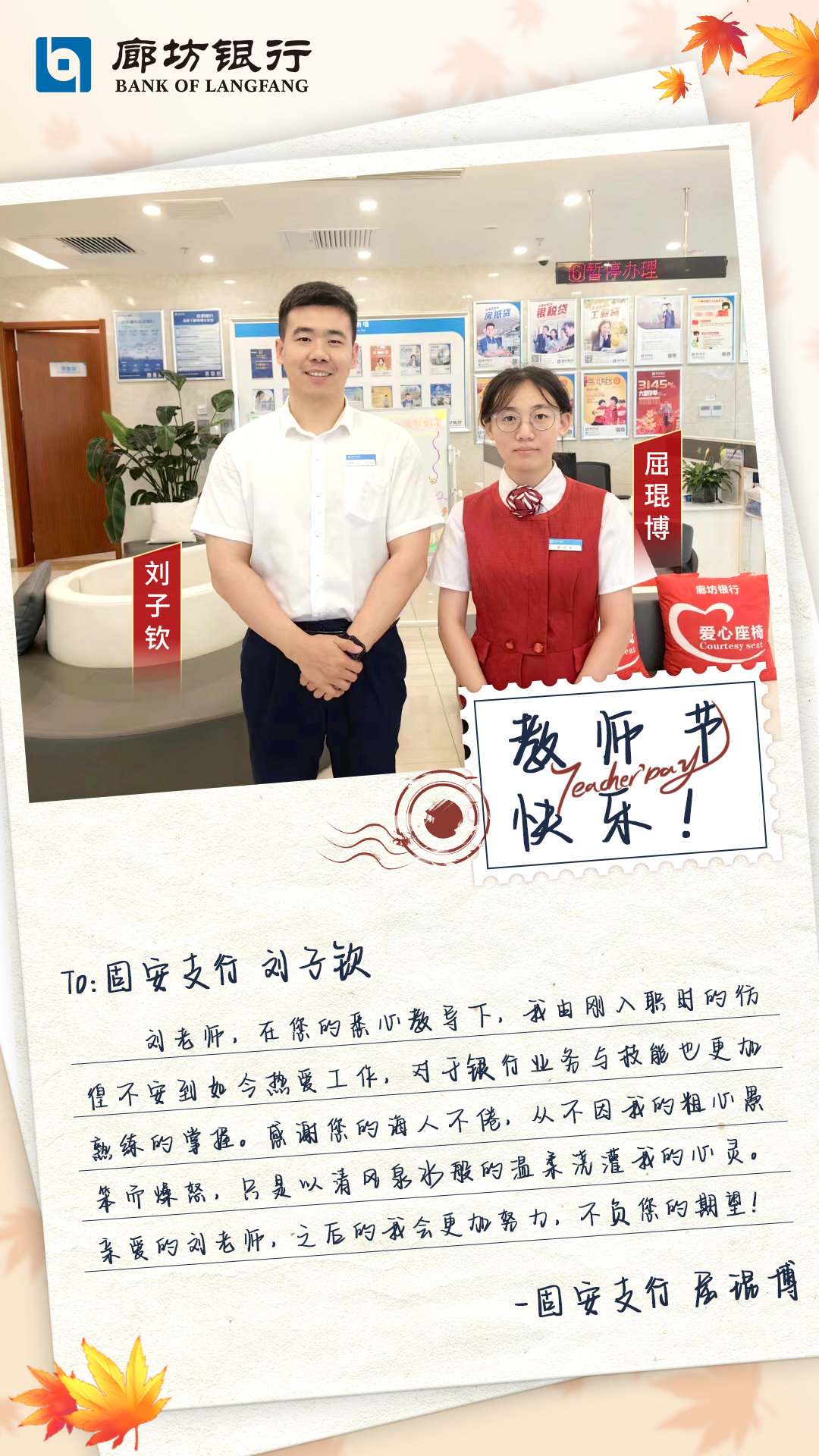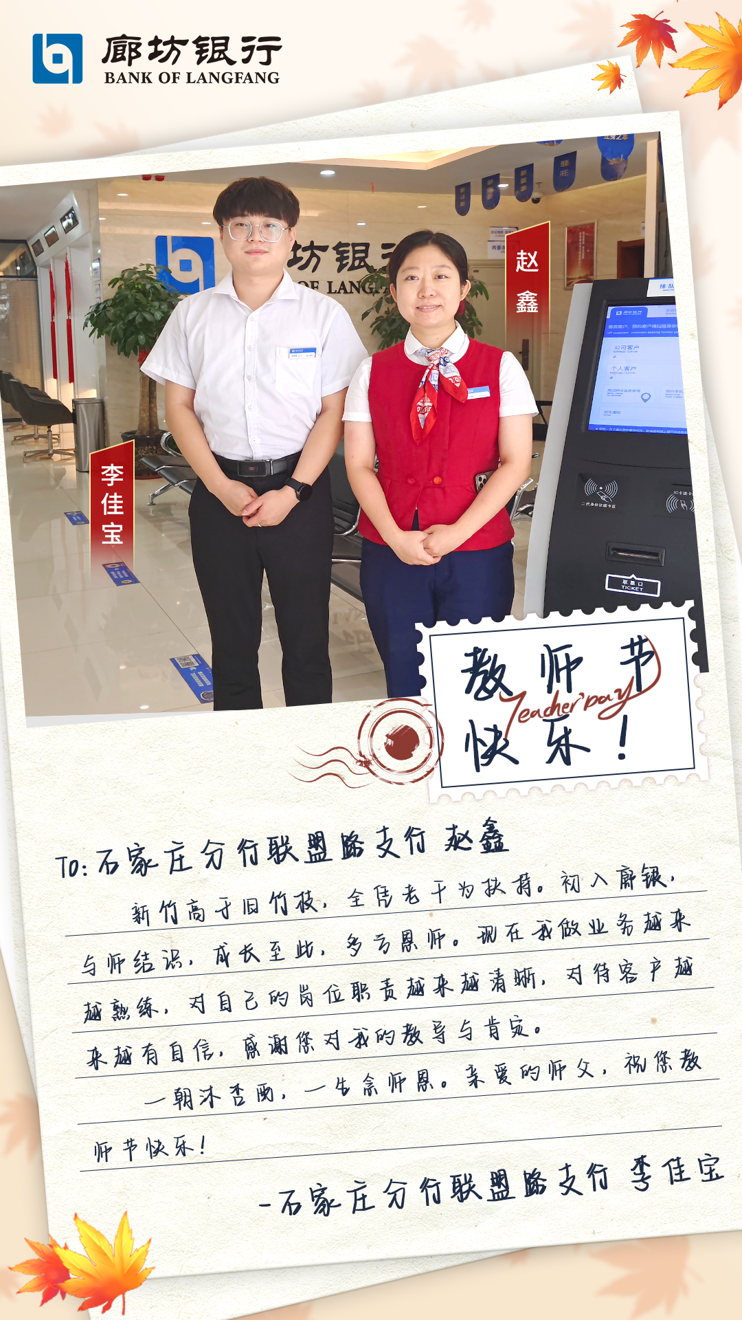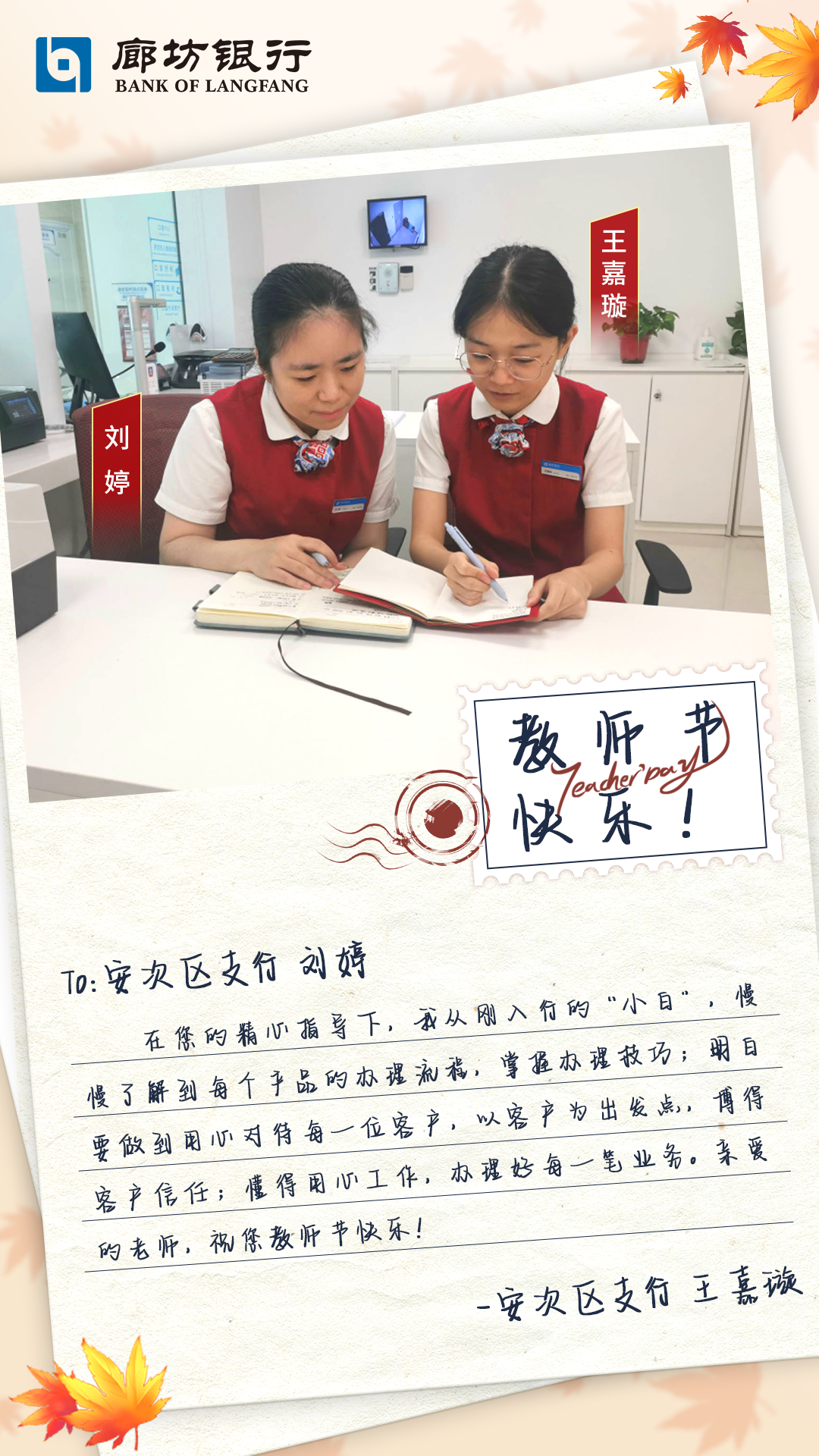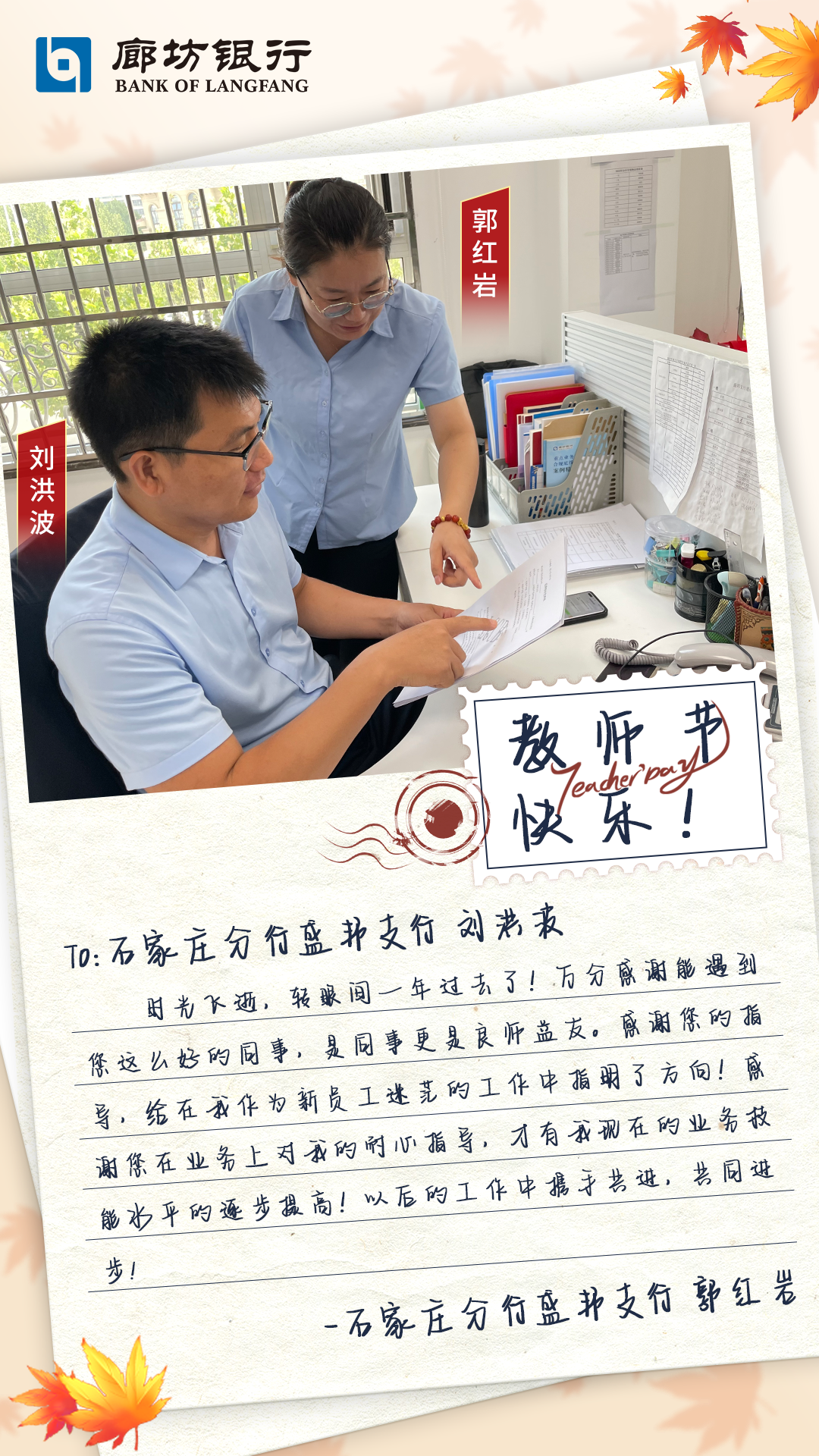 入职廊坊银行大厂支行以来,感谢您用专业知识指导我,教会我对待客户要将一颗真心交付,我可能不是您最出色的学生,但您却是我最崇敬的老师,值此教师节之际,衷心祝您:身体健康,工作顺利,教师节快乐!