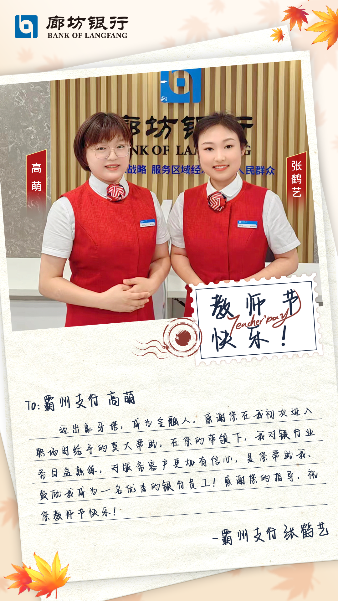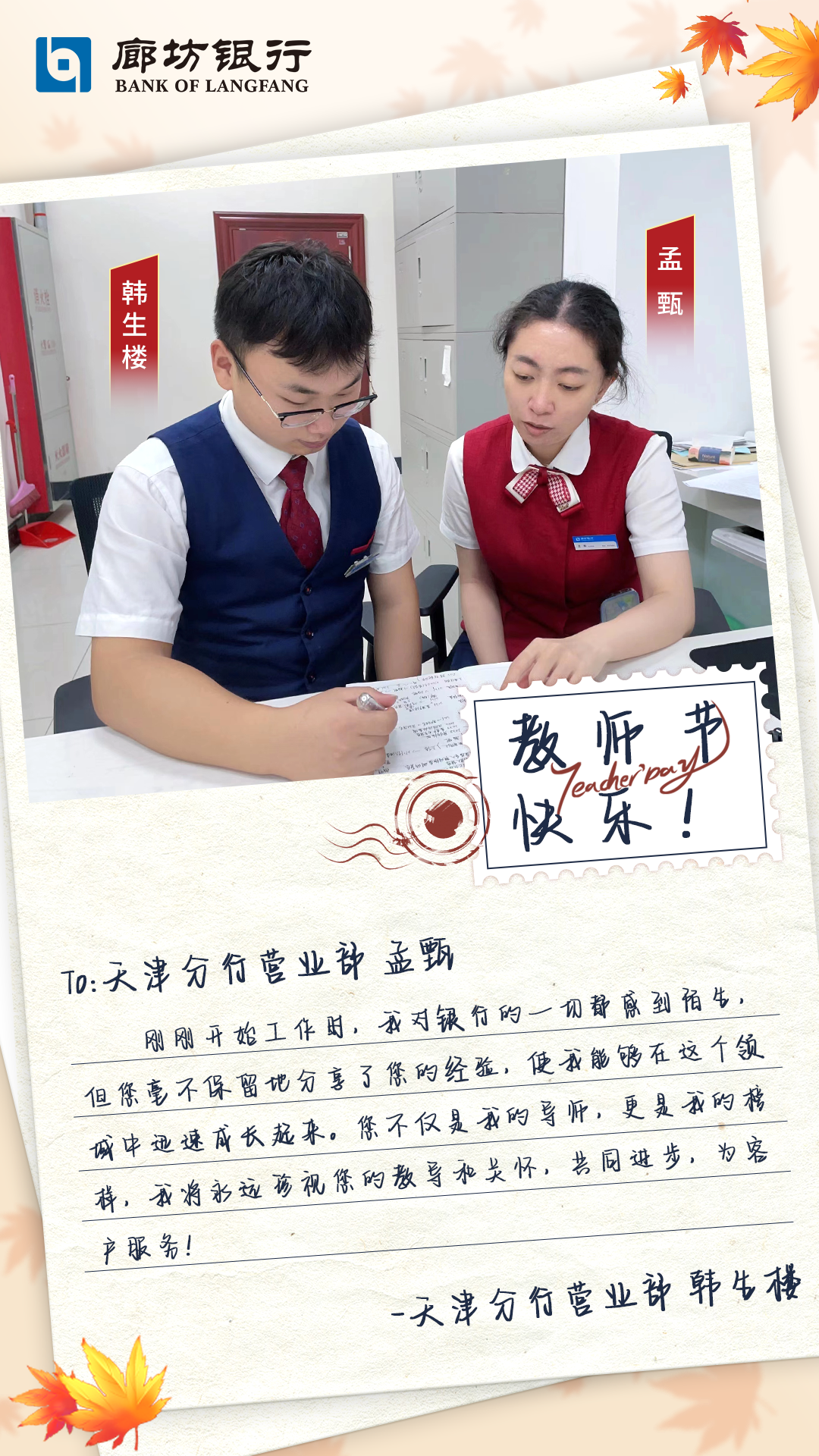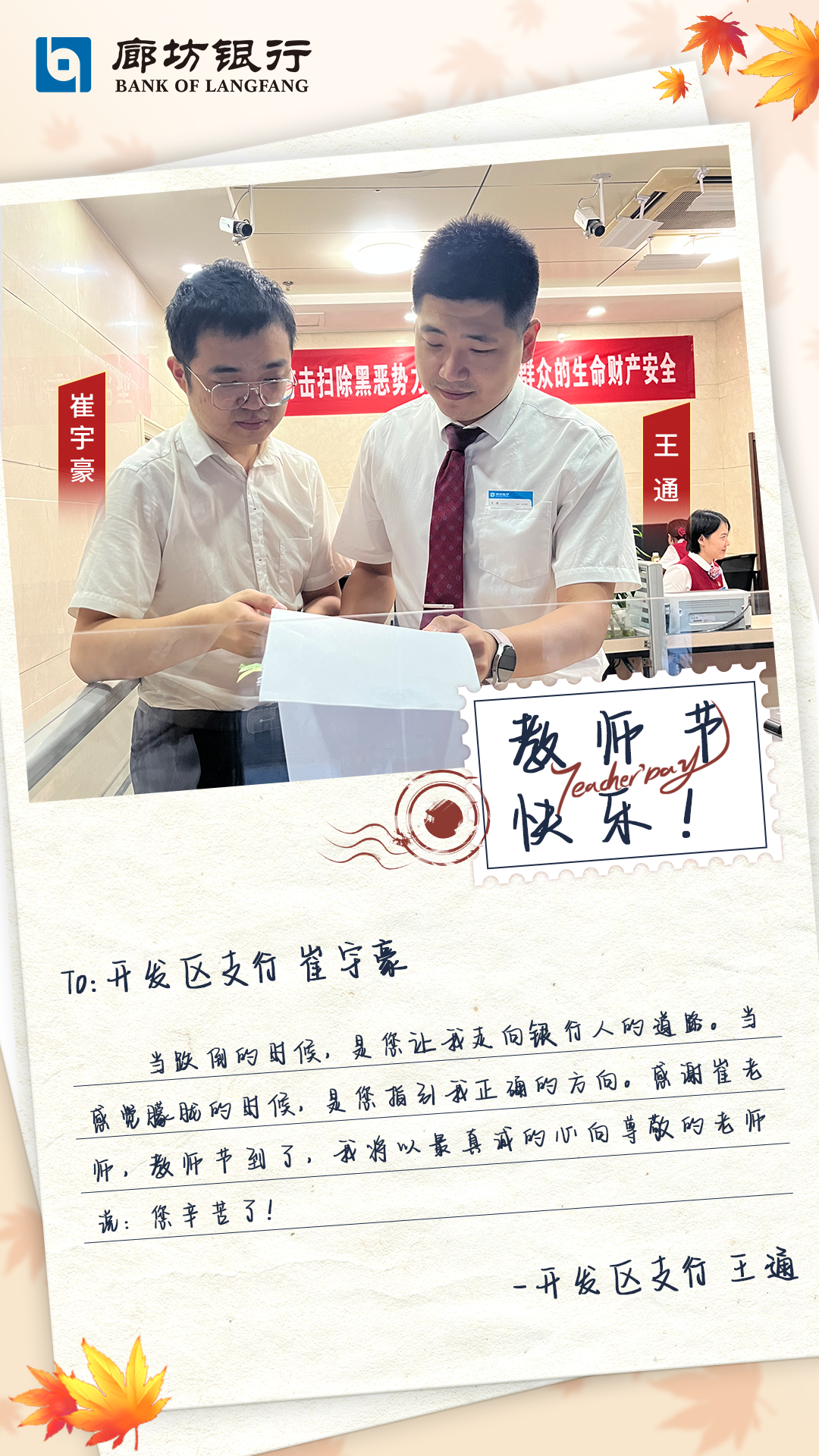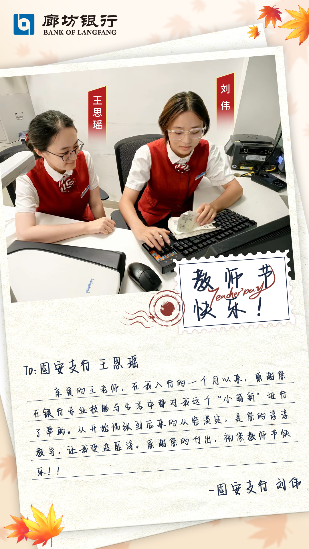 入职廊坊银行大厂支行以来,感谢您用专业知识指导我,教会我对待客户要将一颗真心交付,我可能不是您最出色的学生,但您却是我最崇敬的老师,值此教师节之际,衷心祝您:身体健康,工作顺利,教师节快乐!
