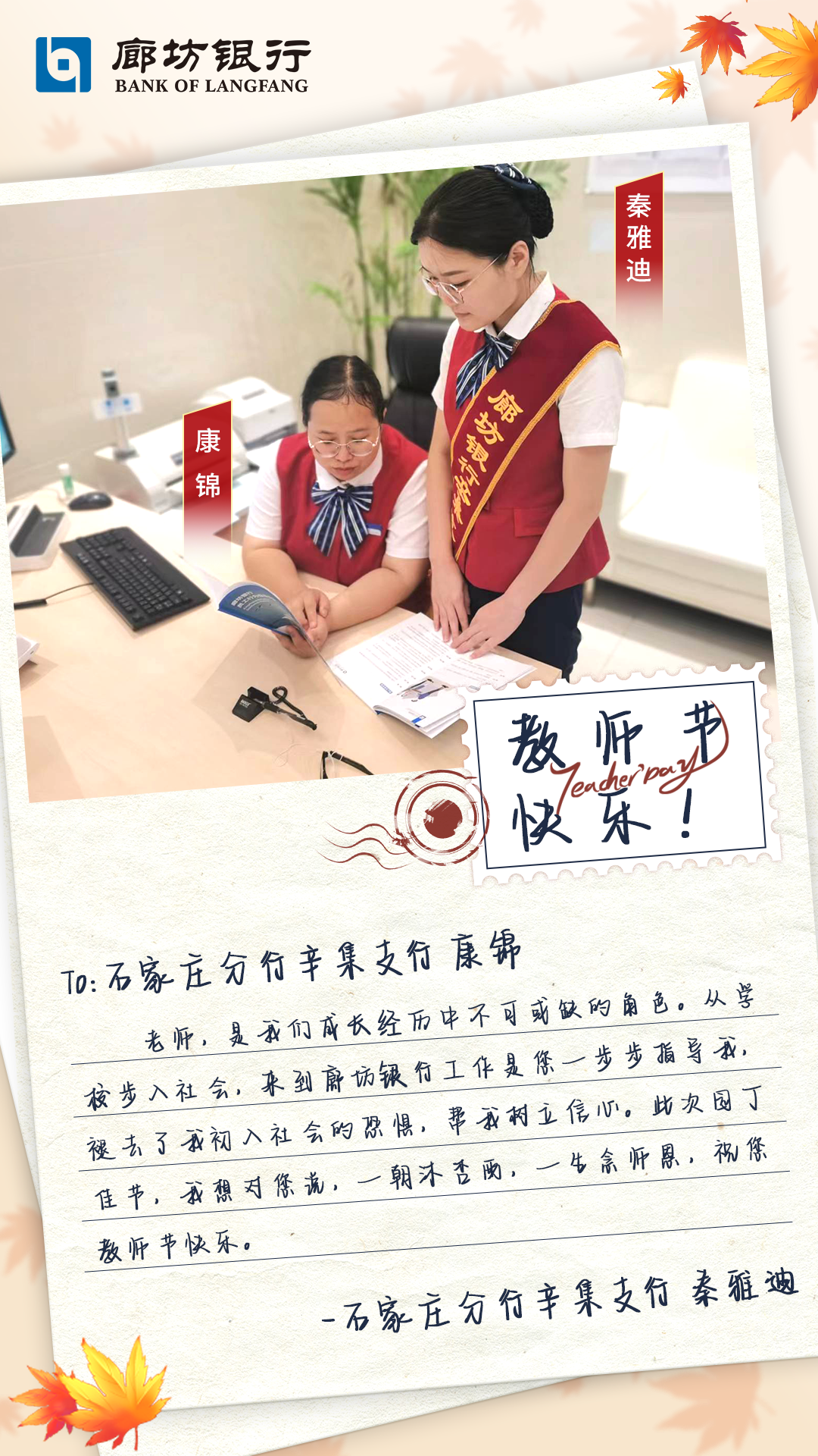 老师,是我们成长经历中不可或缺的角色。从学校步入社会,来到廊坊银行工作是您一步步指导我,褪去了我初入社会的恐惧,帮我树立信心。此次园丁佳节,我想对您说,一朝沐杏雨,一生念师恩,祝您教师节快乐。
