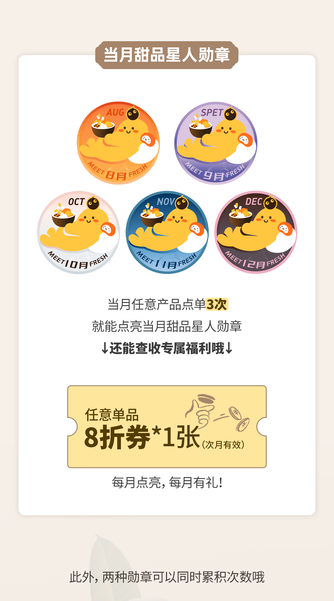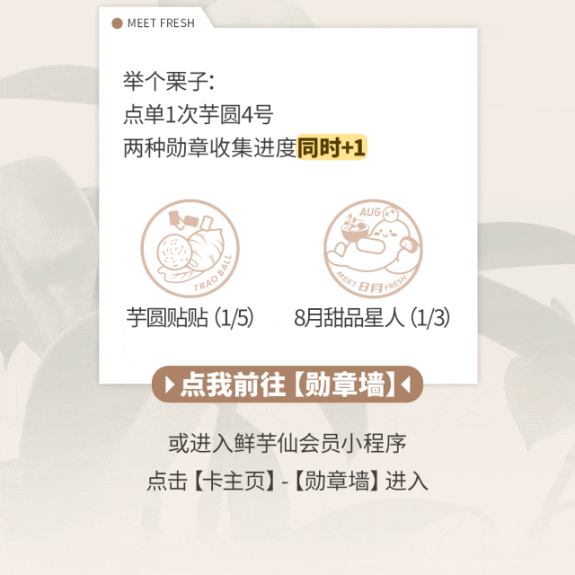 元气up up,燥热down down,咖啡一续 秋天快乐继续,动感地带 别有冻天,花样吃冰节,尽在鲜芋仙!冻~冻~冻~福利来敲门 怦然好心冻免单麻薯米乳冰#好哇晒的暑假#快乐进行中你晒单,我免单点我查看活动详情「勋章墙」全新上线点亮勋章 奖励8折作为小仙家的真爱粉怎么能没有荣誉认证?超多成就勋章,等你集齐点亮!勋章一共两大类点亮攻略看这里!