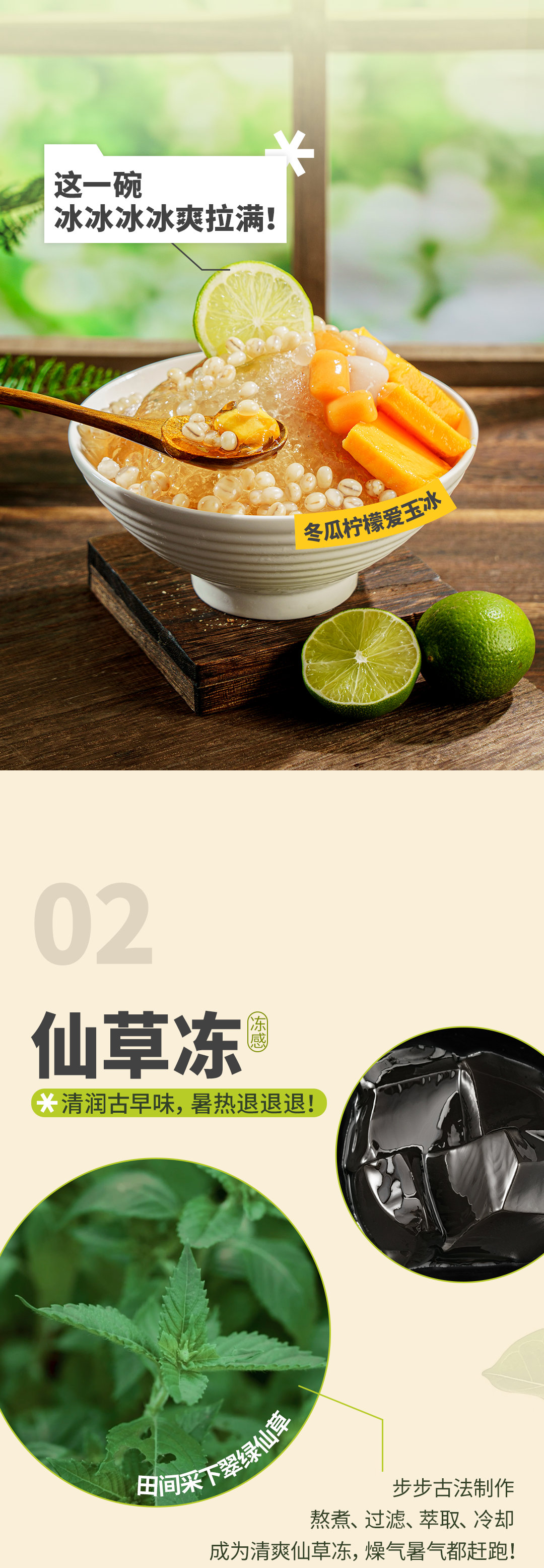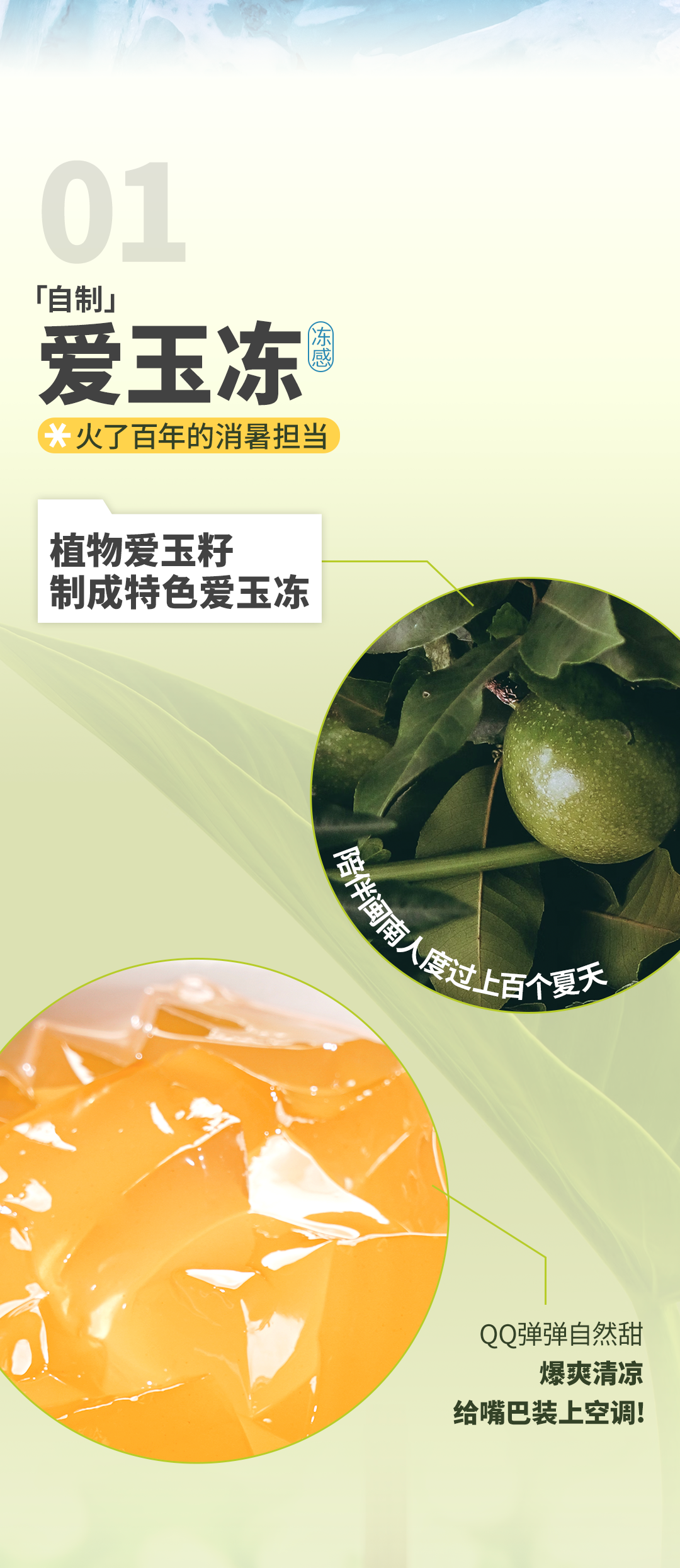 自制爱玉冻,火了百年的消暑担当,植物爱玉籽,制成特色爱玉冻,陪伴闽南人度过上百个夏天,QQ弹弹自然甜,爆爽清凉,给嘴巴装上空调!这一碗 冰冰冰冰爽拉满!冬瓜柠檬爱玉冰,仙草冻,清润古早味,暑热退退退!田间采下翠绿仙草,步步古法制作,熬煮、过滤、萃取、冷却,成为清爽仙草冻,燥气暑气都赶跑!从田到甜,一碗好解暑好新鲜,鲜芋仙招牌产品图重点呈现,咖啡冻,三伏天,精神状态「凉」好!吸溜一口~超爽滑!有回甘!