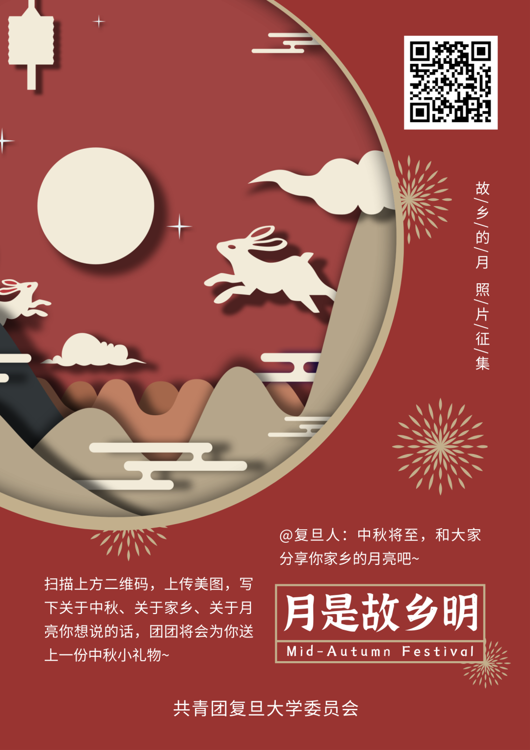 共青团复旦大学委员会在此发起“故乡的月”摄影作品征集活动,向各位FDUer征集中秋赏月的美图以及节日寄语,更有精美的中秋小礼物等待大家哦!