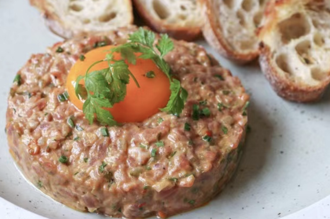 佐酒前菜中的绝绝子!一刀划开,释放出新鲜的蛋液,浸润到鲜辣的牛肉上,搭配一片脆香法棍:酸,甜,鲜,辣,咸五味在舌尖迸发~WOW,再搭配wineapp精选的红葡萄酒,美味人间!