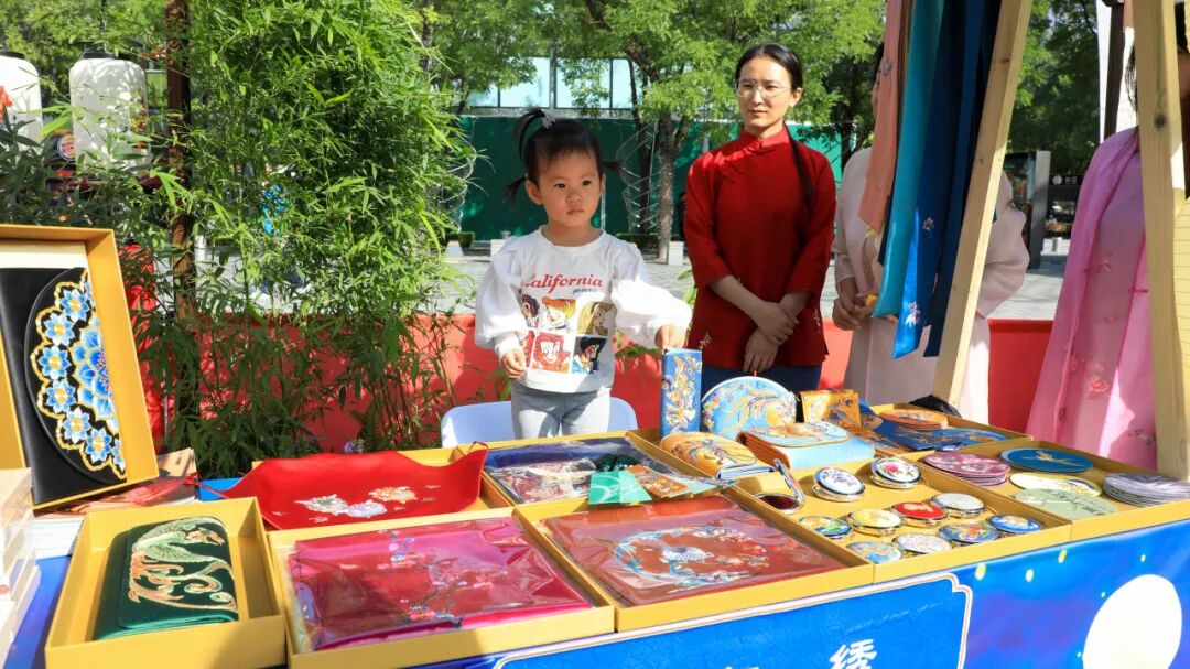通过一件件精妙的作品各种轻巧的构思、精湛的技艺,让居民在携手赶集中感受非物质文化遗产当中蕴含的独特文化、精神财富、文明底蕴,在体验互动中体味手工打造的指尖温度,见证代代相传的先人智慧。中秋市集里,不少非遗项目都带了最新的文创产品,京绣体恤、盘扣耳饰、雕漆挂饰等等,引得前来赶集的游客驻足观赏,并把心仪的好物带回家。