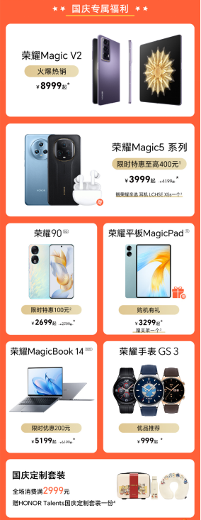 不论是打破直板机和折叠屏的边界、引领折叠屏手机进入毫米时代的折叠屏荣耀Magic V2,还是荣耀Magic5系列、荣耀90系列、荣耀平板MagicPad 13、荣耀MagicBook 14系列2023等大热产品,均有诚意十足的限时优惠价格福利,同时多款产品还可参与“买即赠”活动。此外,全场消费满2999元,更可享限量HONOR Talents国庆定制套装,内含保温杯、U型枕等可爱贴心的小礼物,全方位贴心守护用户假期出游舒适感。