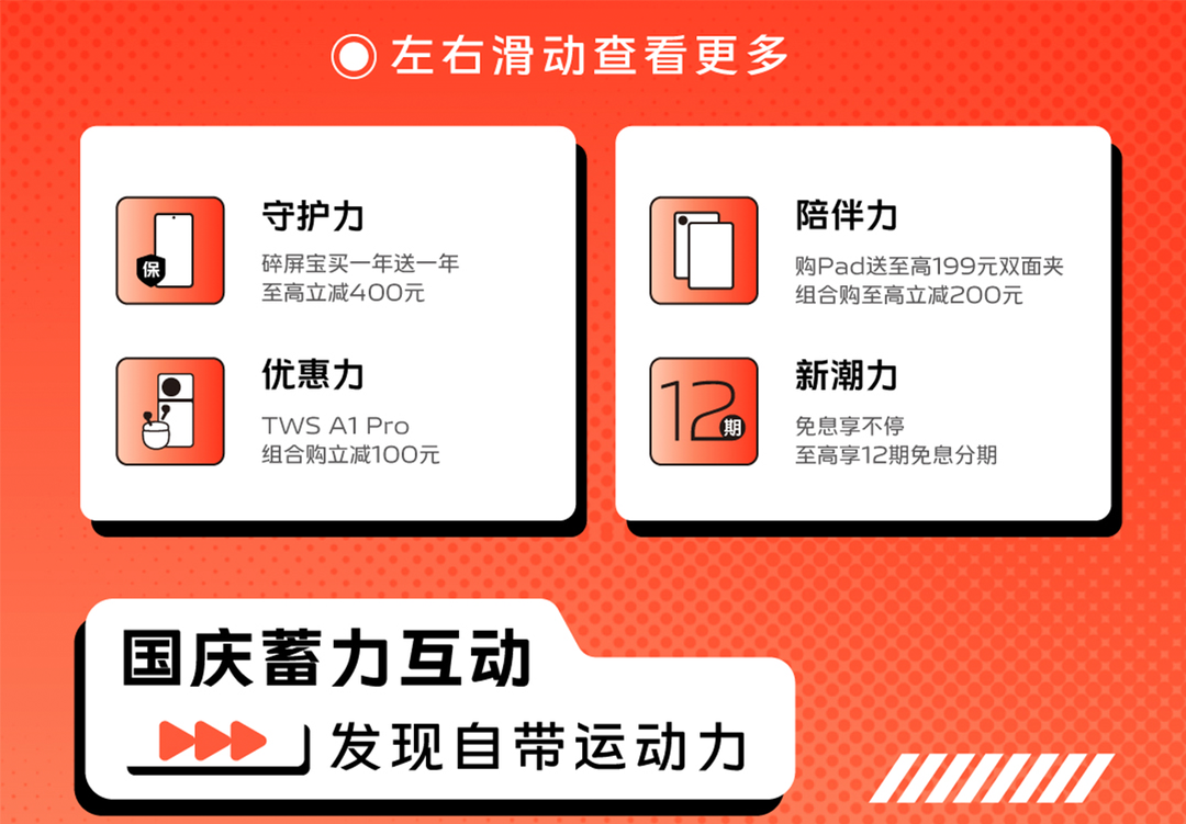 除了持续打造具备标杆意义的体验高地,为消费者带来更好的服务和极致的科技体验,让数字生活和智慧体验变得更加触手可及,本次国庆长假期间,荣耀还将举办丰富多彩的市场活动,并推出国庆专属购物福利,多款热销产品均加入其中。