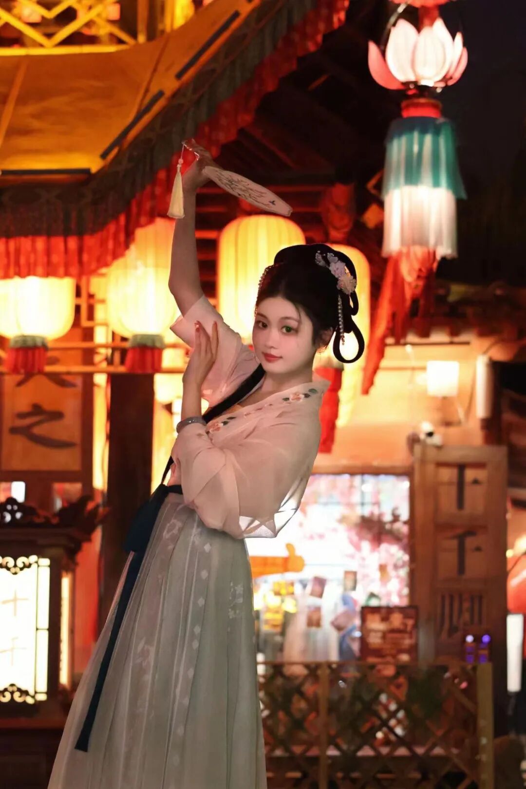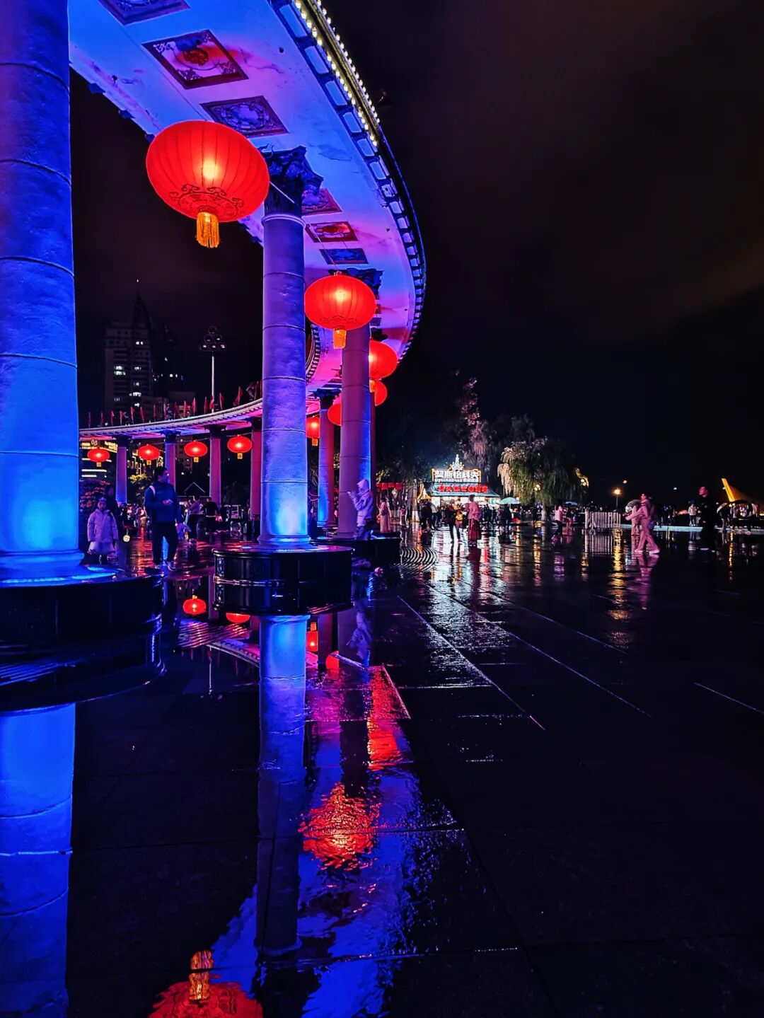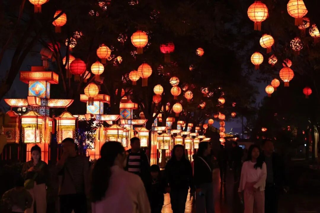 中秋节晚上,防洪纪念塔这儿灯火通明,行人手上提着小灯笼,头顶上挂着大灯笼……