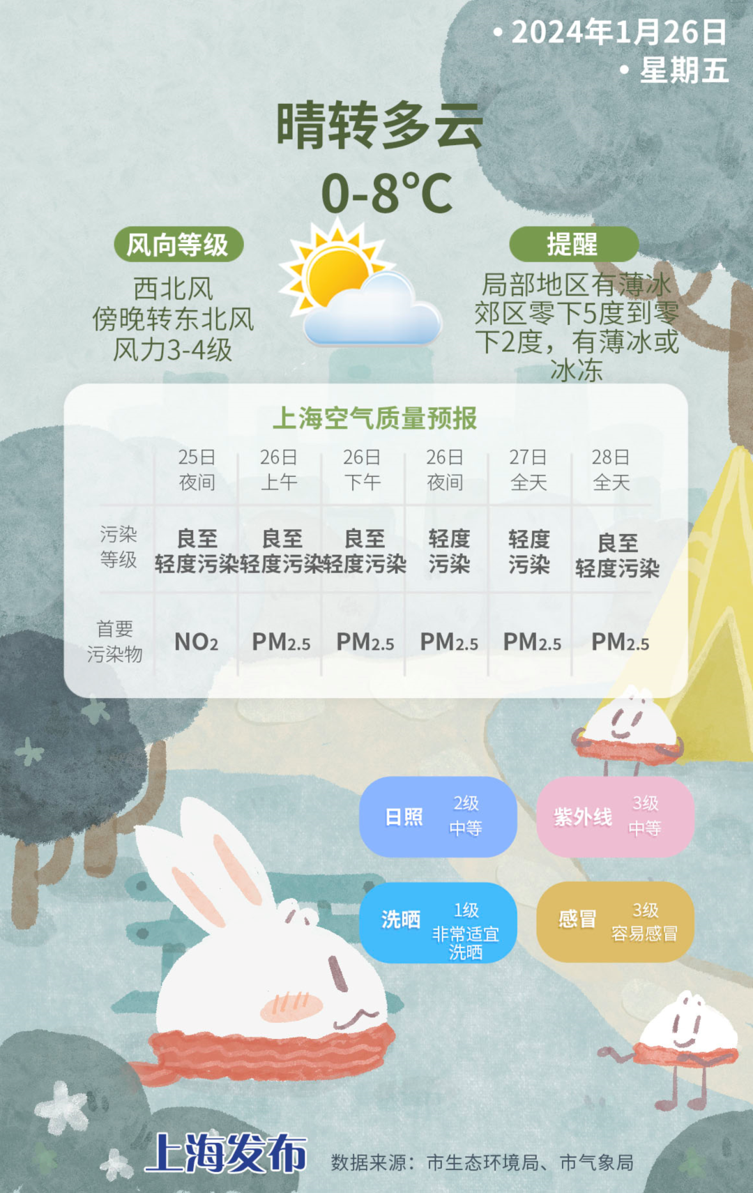 1月27日(周六):多云到阴转多云到阴局地有短时小雨,3~9度