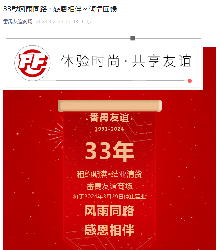 “番禺友谊商场将于3月底正式结业”。
