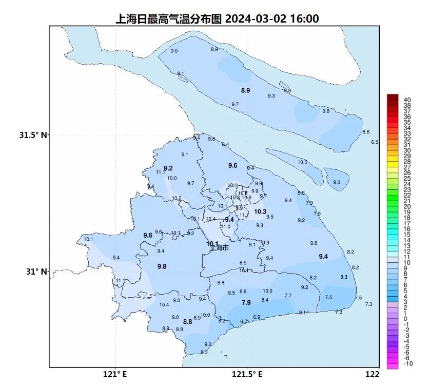 上海今天是多云到晴的好天气。受冷空气和辐射降温的共同影响,今天早间气温较低,市区徐家汇站为1.0度,郊区大部在零下3度到零下1度之间,崇明零下3.5度为最低。白天阳光快速上线,气温明显回升,全市最高气温普遍在8~11度之间。需要提醒的是,今天部分郊区的昼夜温差超10度,晚归还是要注意保暖。