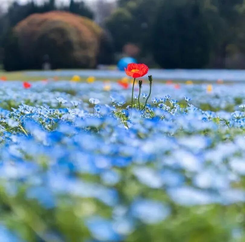 上海滨江森林公园在枫香草坪花海区域种植了大片的喜林草,大面积蓝色的小花铺满在草坪间,鲜艳的冰岛虞美人点缀其中,给市民游客很好的游园体验。