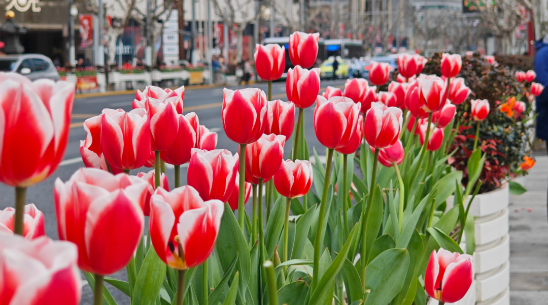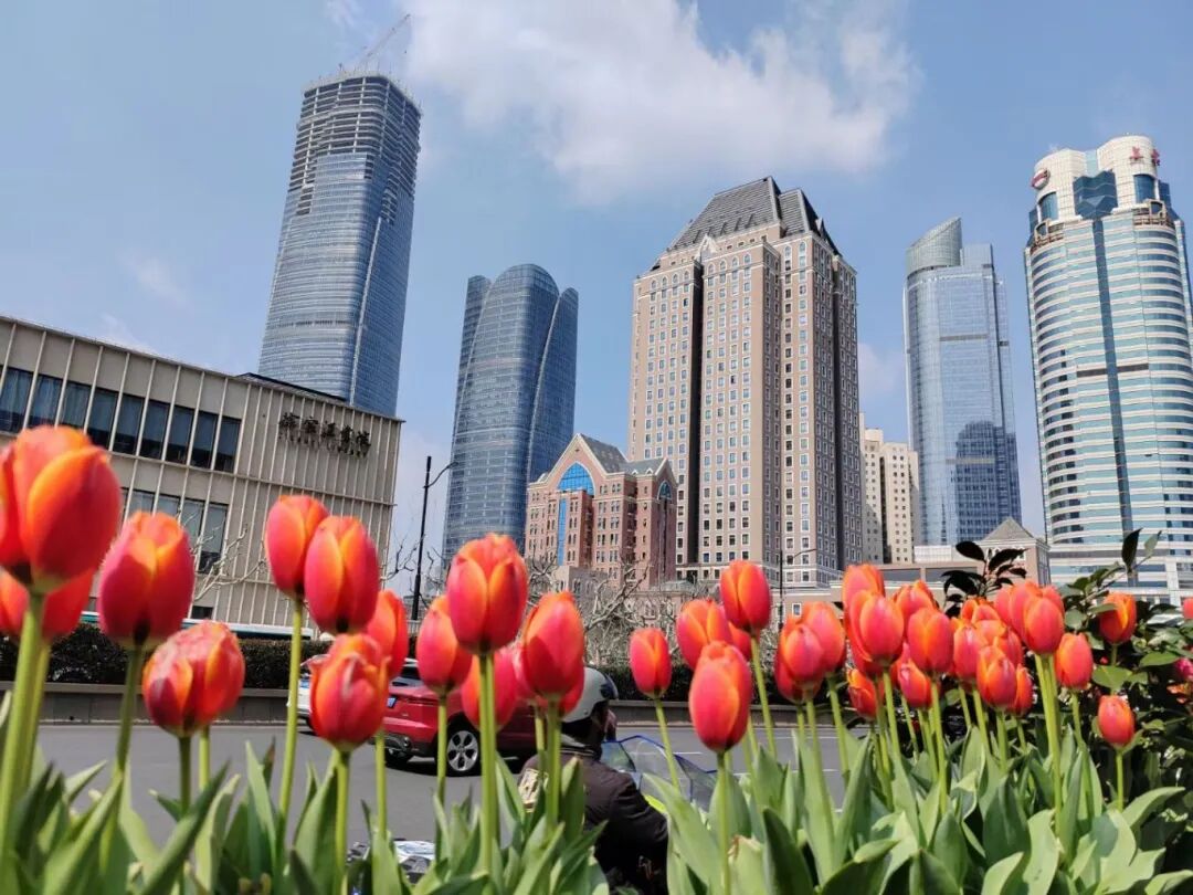在南京西路,鲜艳盎然的春意总能夺走行人的目光,郁金香已大片绽放,装点繁忙的商圈街道。快来感受这里“第一眼春天”的盛开。
