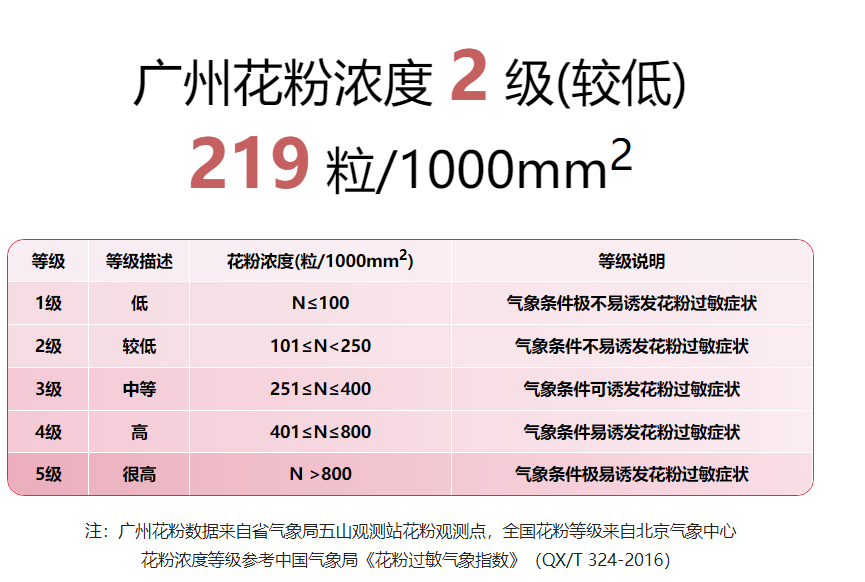 广州市林业和园林局有关人士告诉记者,花粉指数是指空气中单位体积内花粉颗粒的数量。指数的大小直接反映了空气中花粉的含量。花粉含量越高,意味着空气中的花粉浓度越高,花粉指数也就越大。对花粉过敏的市民,则可以点开浮动窗口内的“花粉指数”,查看广州的花粉浓度以及对应等级。![]()
