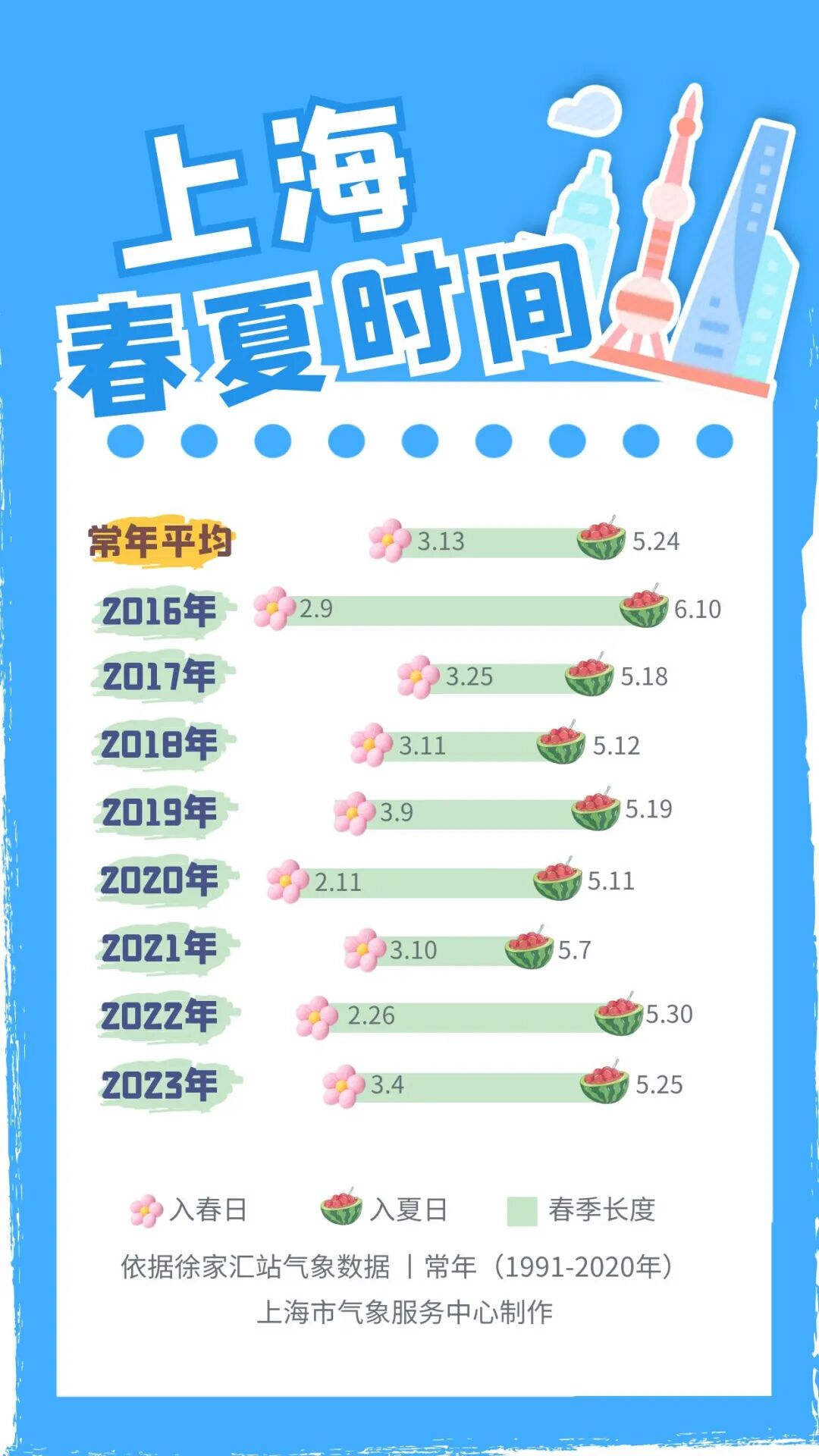 关于上海“入夏”:上海常年平均入夏时间是5月24日(1991年-2020年,徐家汇站)。近十年来最早入夏为2021年5月7日,最晚为2016年的6月10日。