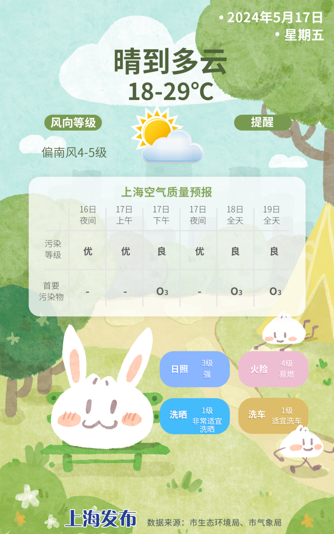 具体预报:晴到多云,18~29度,偏南风4~5级,沿江沿海地区阵风6级,相对湿度70%~20%。火险等级气象指数4级,易燃。