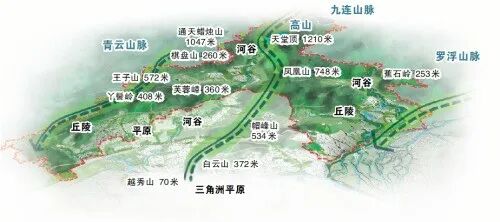 “三脉”之中的九连山(因环连增城、从化、龙川等9地而得名)与广州城关系最密切,逾千米的山峰数这里最多。九连山源自大庾岭(南岭之一),自粤赣两省交界处向西南挺进,从天堂顶、鸡枕山、黄茶园、老虎头、三角山、烧伤岭、三角髻、牛牯嶂、八仙岭、平顶等逾千米的山峰,到大尖山、凤凰山、杨大岭,再到帽峰山,最后到白云山、越秀山,几成“一字”排列入城,构成了“远山为屏、中山依郭、余脉入城”的盛景。![]()