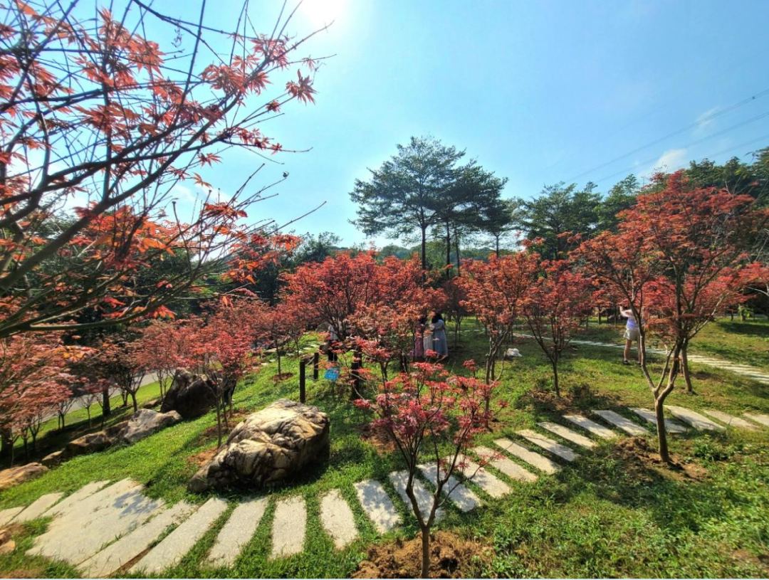 大岭山林场一山谷中,两扇峭壁对峙如门,石门国家森林公园因而得名。冬天气温骤降时,公园3000亩枫叶转红层林尽染,素有“广州香山”之称。![]()