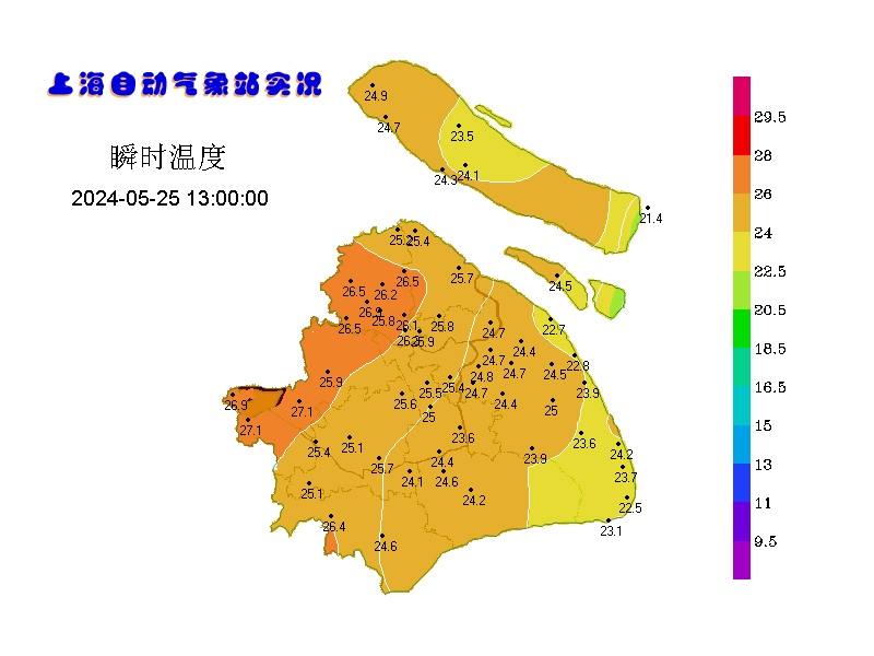 申城今天云系较多,阴到多云的天气为主,东南风增大为4-5级,气温上升受阻,最高气温普遍是在24-27度之间,较昨天低了2-4度。由于空气湿度较大,午间体感略有些闷。