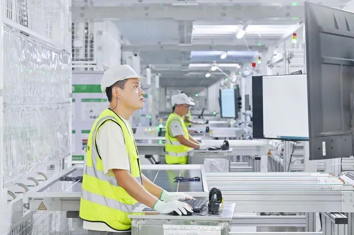 工人在位于浙江省乐清市的正泰集团8GW高效光伏组件生产基地工作(资料照片)。新华社发