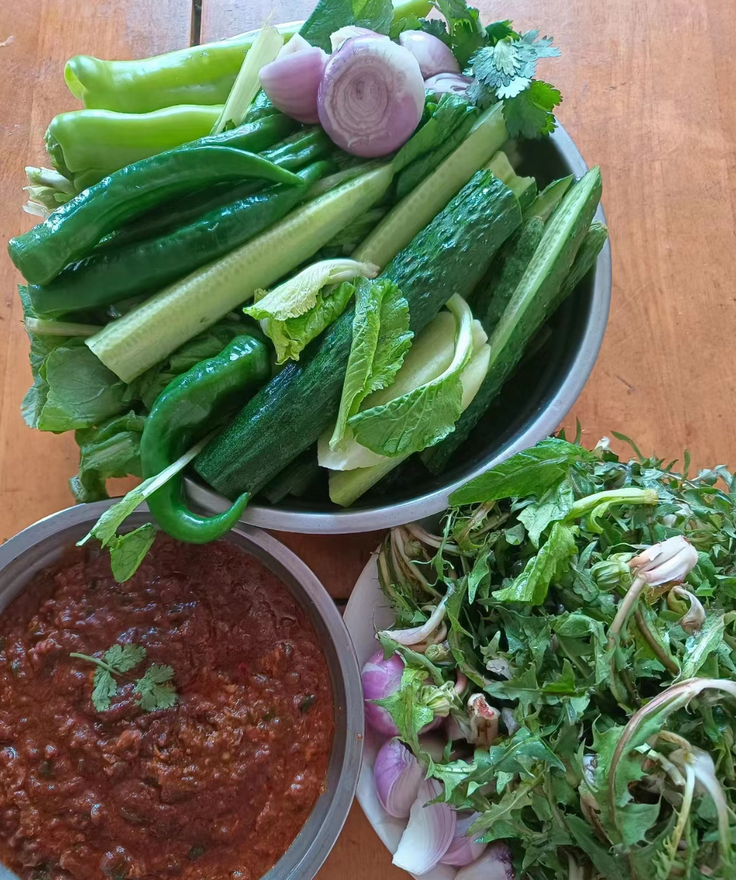 黑龙江人还喜欢“万物皆可蘸”。新鲜的蔬菜+生吃+蘸酱=蘸酱菜,相当于东北版的蔬菜沙拉。