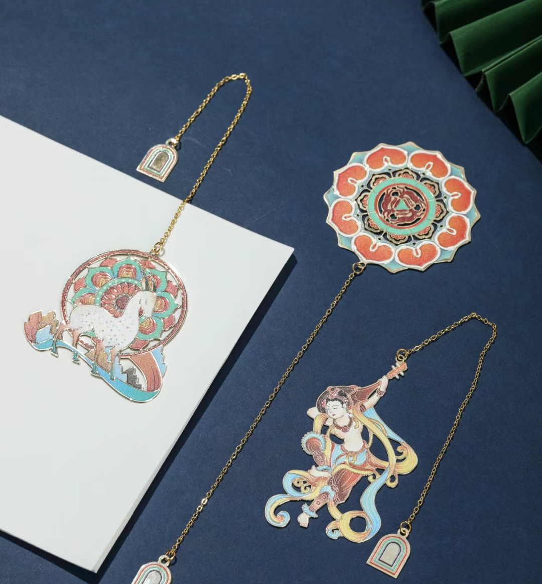2016年至今,敦煌文创自主研发设计了九色鹿系列胸针、伎乐天系列钥匙扣、乐舞飞天书签等3000余款独具特色的文创产品,让更多人把敦煌文化带回家。