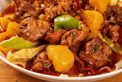 红红火火的大盘鸡也是特色美食之一,大大的鸡块、扎实的面条、绵软的土豆,尝一口绝对停不下来的节奏,谁能拒绝大口吃肉的快乐!
