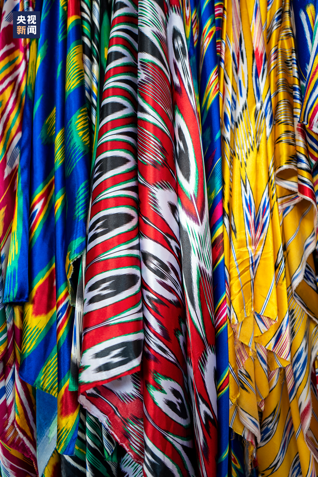 在喀什,你会看到很多女子穿着彩条的连衣裙,这是一种用艾德莱斯绸做的衣服。艾德莱斯绸已有2000多年的历史,制作工艺复杂,质地柔软、色泽艳丽。2008年,艾德莱斯绸织染技艺入选国家级非物质文化遗产↓
