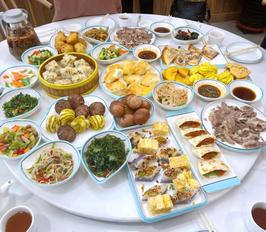 油香、馓子、拉面、香豆子花卷、八宝茶、小菜、牛肉、羊杂、小笼包、水煎包、锅贴、富贵饼、玉米饼、发糕、搅团等三十多种美食,光看名字就已让人流下口水。