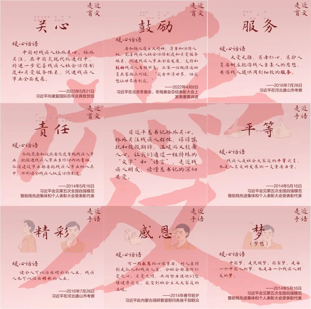 习近平总书记格外关心、格外关注残疾人群体,谆谆嘱托和殷殷期许,温暖而又鼓舞人心。让我们通过一组特殊的“文字”和“语言”,走近残疾人朋友,读懂总书记的深切关爱。