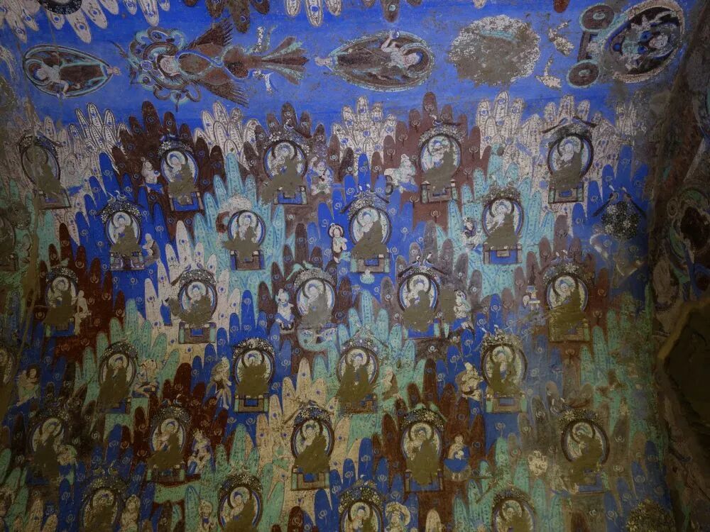 走进克孜尔石窟的第14、17、38、171窟,满眼的蓝绿色彩相互交织,如山峦叠嶂般铺满墙壁与券顶,令人炫目。定睛观看,所谓的“山峦”是一个个菱形格,每个菱形格中都绘制着故事,整齐而有序,平衡且庄严。这种构图形式,不仅令整个空间充满了艺术感,还增加了壁画的容量。