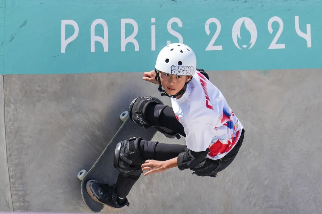 中国选手郑好好在巴黎奥运会滑板女子碗池预赛中(2024年8月6日摄)。新华社记者 杜宇 摄