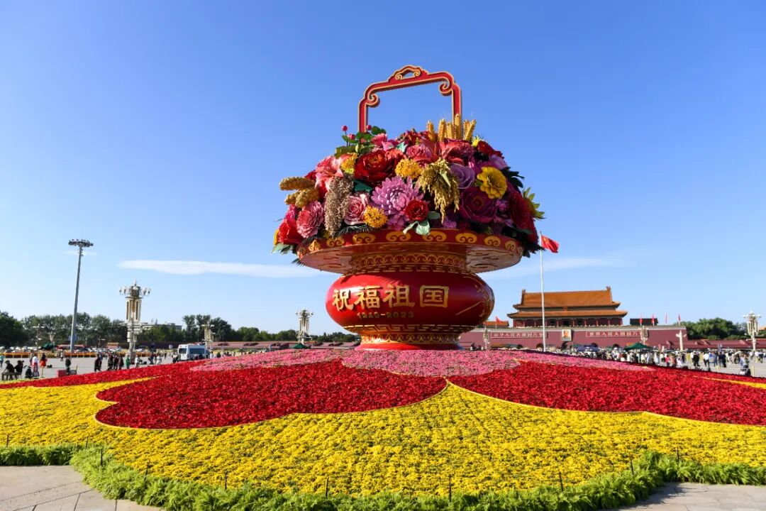 9月27日,市民游客在天安门广场参观“祝福祖国”巨型花篮。新华社记者 鞠焕宗 摄