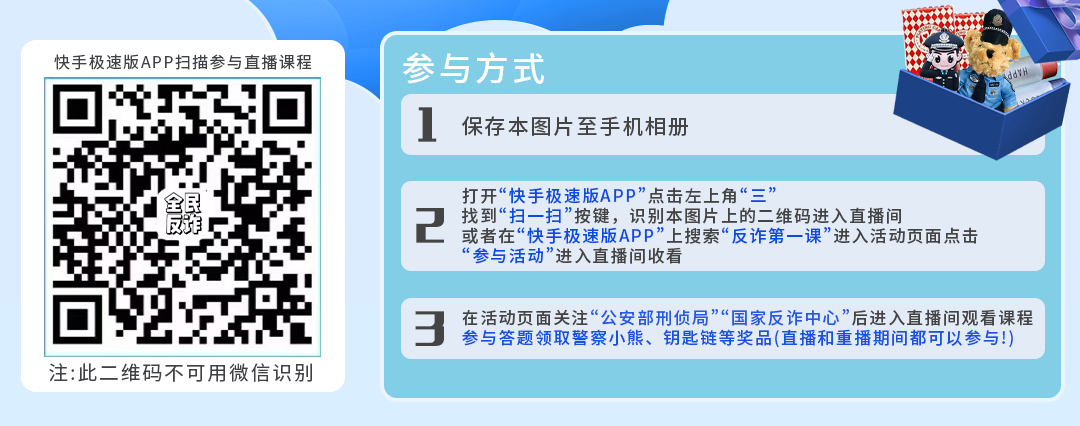 大家可通过快手APP、抖音APP扫描以上二维码,按照操作流程进入直播间参与,也可在快手APP或抖音APP主页面点击右上角,搜索“公安部刑侦局”或“国家反诈中心”,进入直播间学习互动。