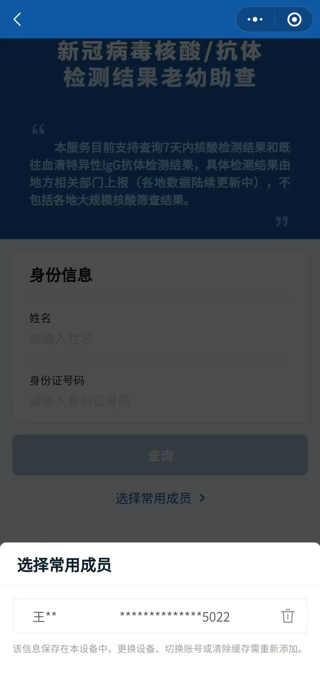 常用成员功能:支持添加5名常用成员,后续可快捷查询核酸/抗体检测结果。常用成员信息将保存在当前设备中,请勿在公共或不可靠的设备上储存添加,如更换设备、切换账号或清除缓存需重新添加。