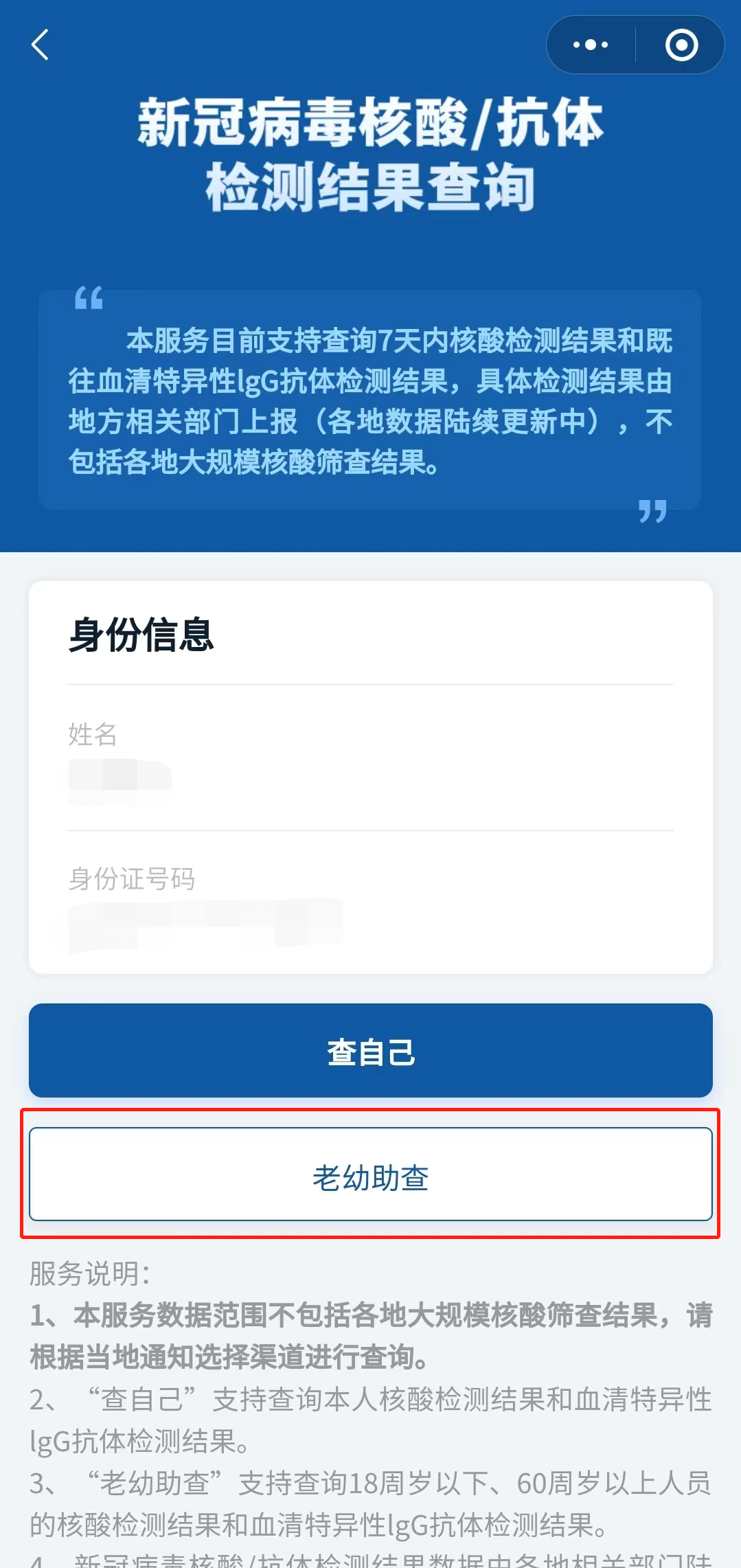 “老幼助查”功能:支持查询18周岁以下、60周岁以上人员7天内的核酸检测结果和血清特异性IgG抗体检测结果,数据由各地相关部门上报。